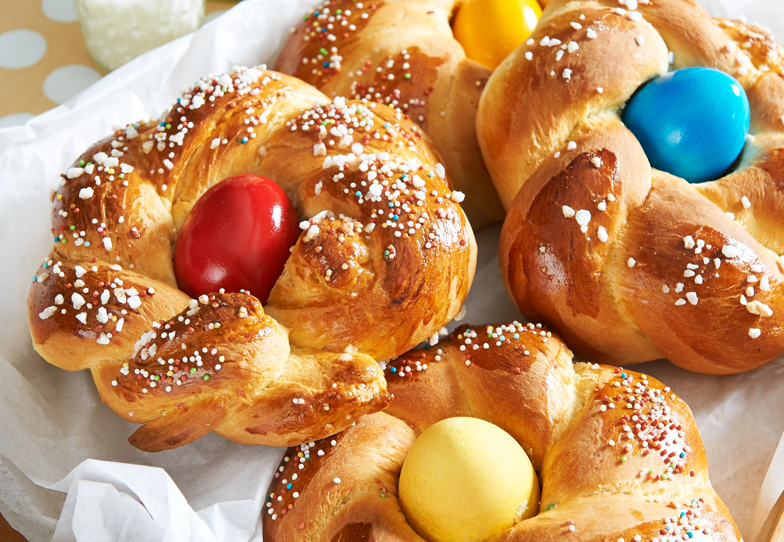 Rohr auf 180°C vorheizen. Backblech mit Backpapier belegen. Aus dem Teig 8 Kugeln formen. Kugeln zu je ca. 25 cm langen Strängen wutzeln. Aus je 2 Strängen einen Zopf flechten, zu einem Kreis formen, Enden leicht zusammendrücken. 30 Minuten an einem warmen Ort gehen lassen.