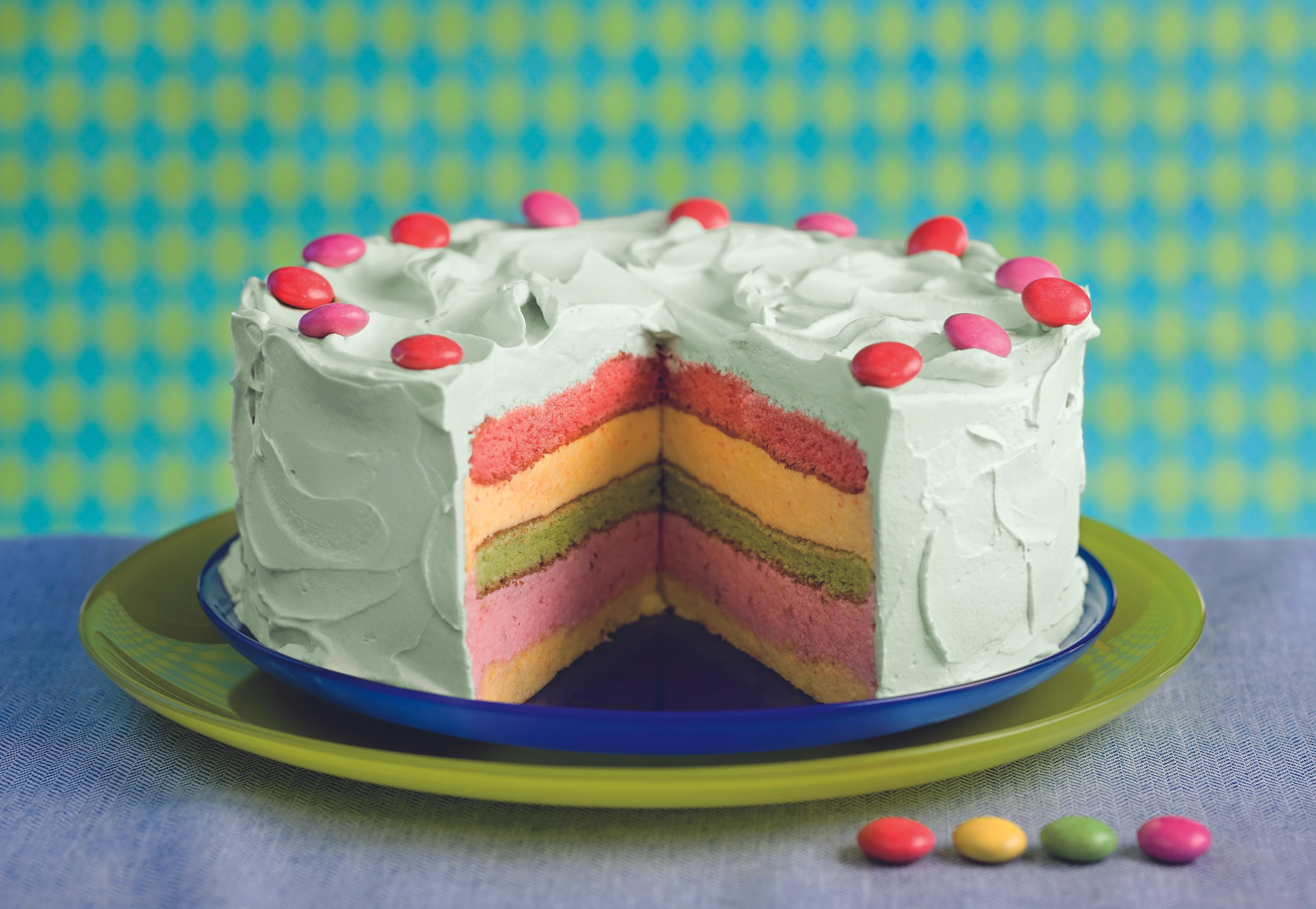 Für die Garnitur Obers steif schlagen, mit grüner Lebensmittelfarbe färben. Torte aus dem Reifen lösen, mit Obers einstreichen und mit den Schokobonbons garnieren.