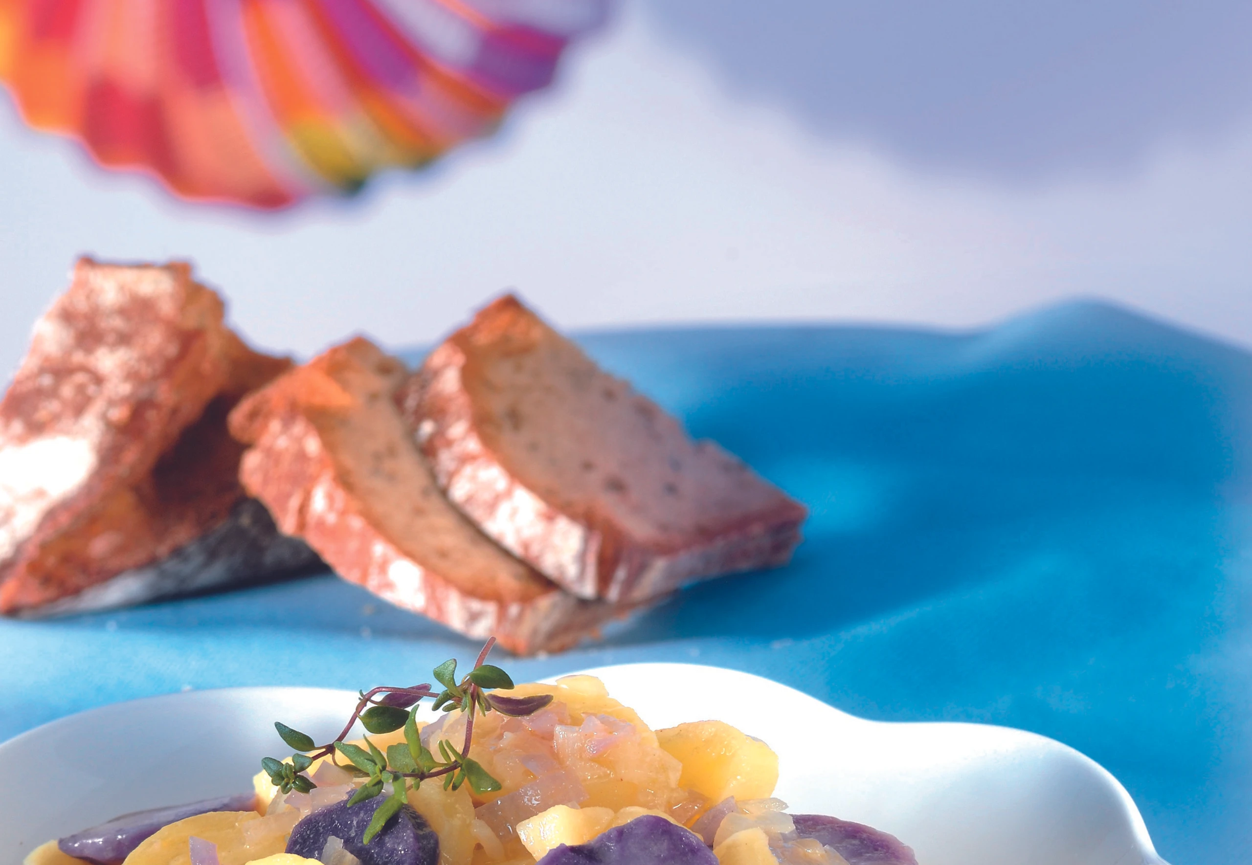 Die beiden Erdäpfelsorten bissfest dämpfen. Erdäpfel noch heiß schälen und in gleich dicke Scheiben schneiden.