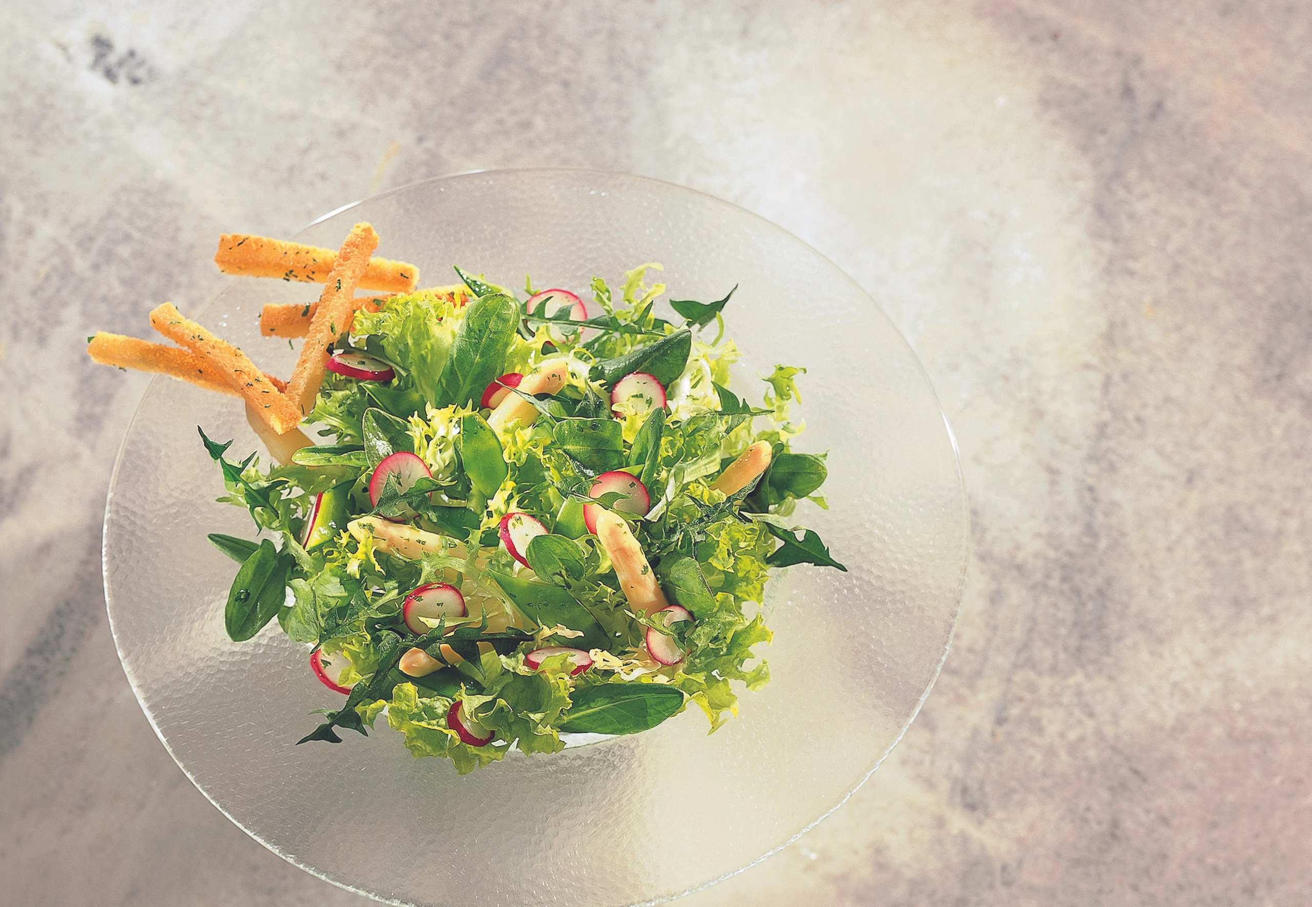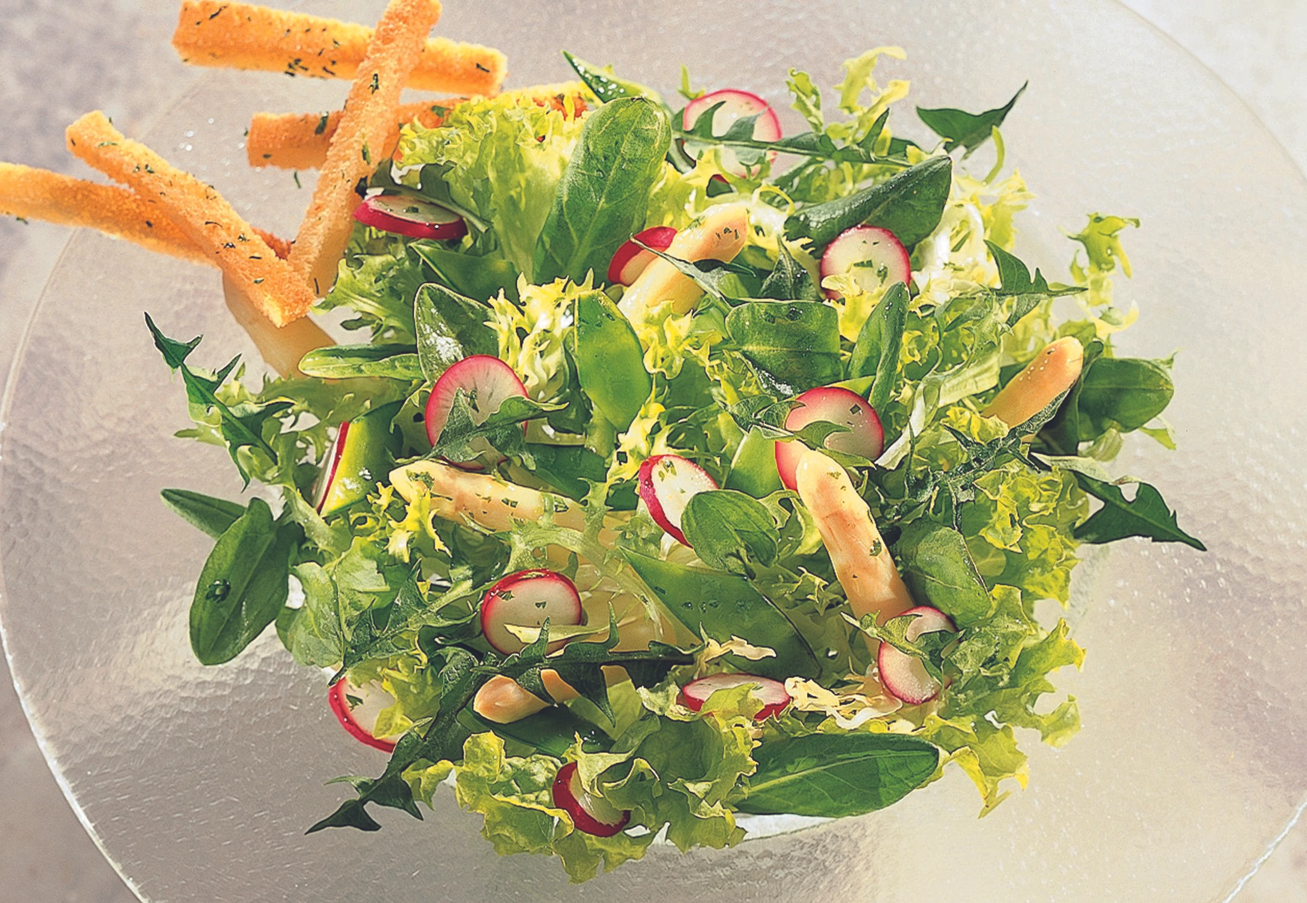 Essig mit Salz, Pfeffer und Kerbel vermischen, Öl unter Rühren zugießen. Die Salatzutaten in eine Schüssel geben, mit der Marinade übergießen und behutsam durchmischen. Salat sofort anrichten und mit den vorher zubereiteten Brotstangerln (siehe Rezept) garnieren.