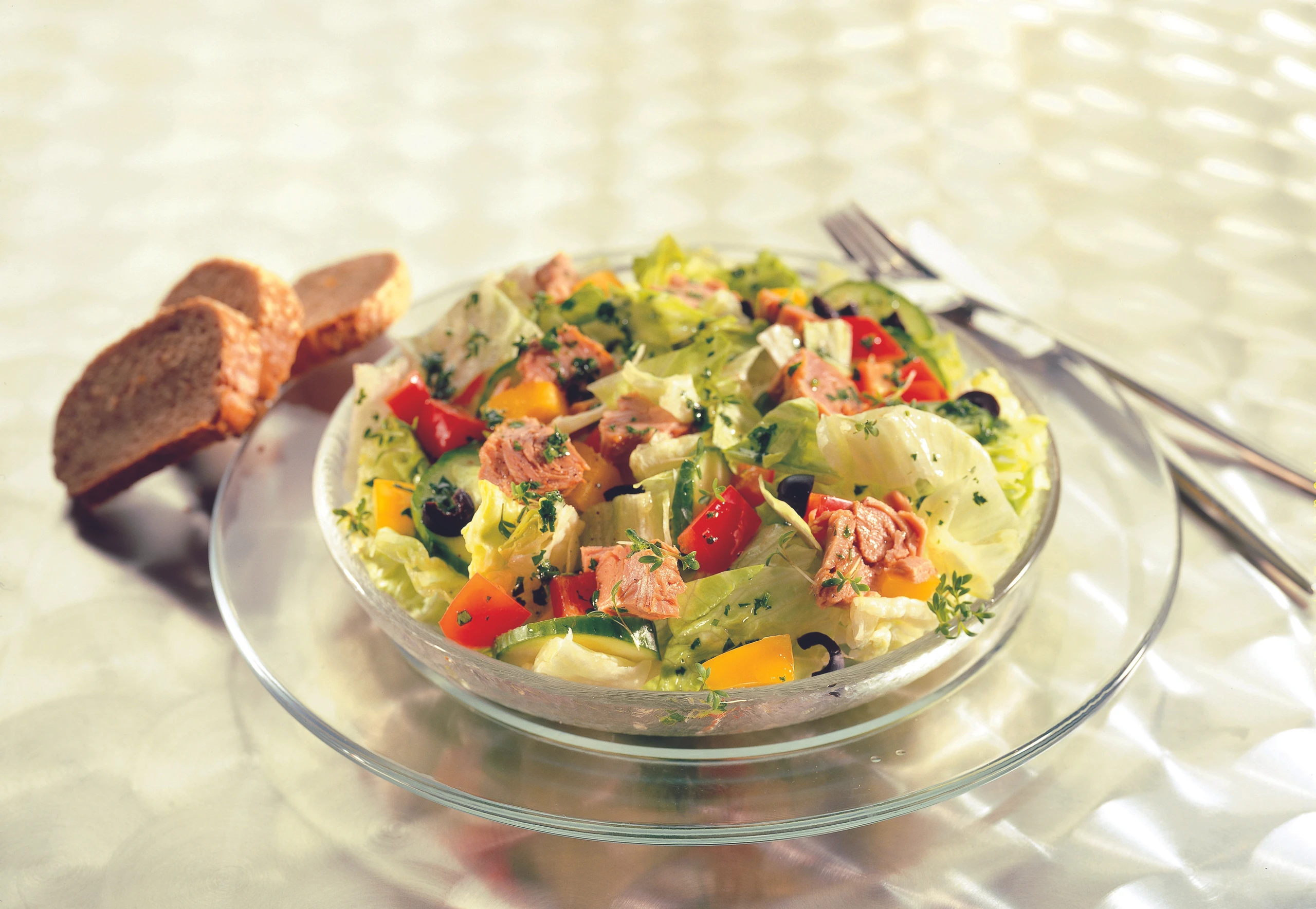 - Thunfisch in einem Sieb gut abtropfen lassen. Paprika waschen, halbieren, entkernen und in 1 cm große Würfel schneiden. Gurke der Länge nach halbieren, dann quer in 1/2 cm dicke Scheiben schneiden. Oliven entkernen und in Stücke schneiden. Salat putzen, zerpflücken, waschen, gut abtropfen lassen und in ca. 2 cm breite Streifen schneiden. Thunfisch in kleine Stücke teilen. Alle Salatzutaten in eine Schüssel geben.