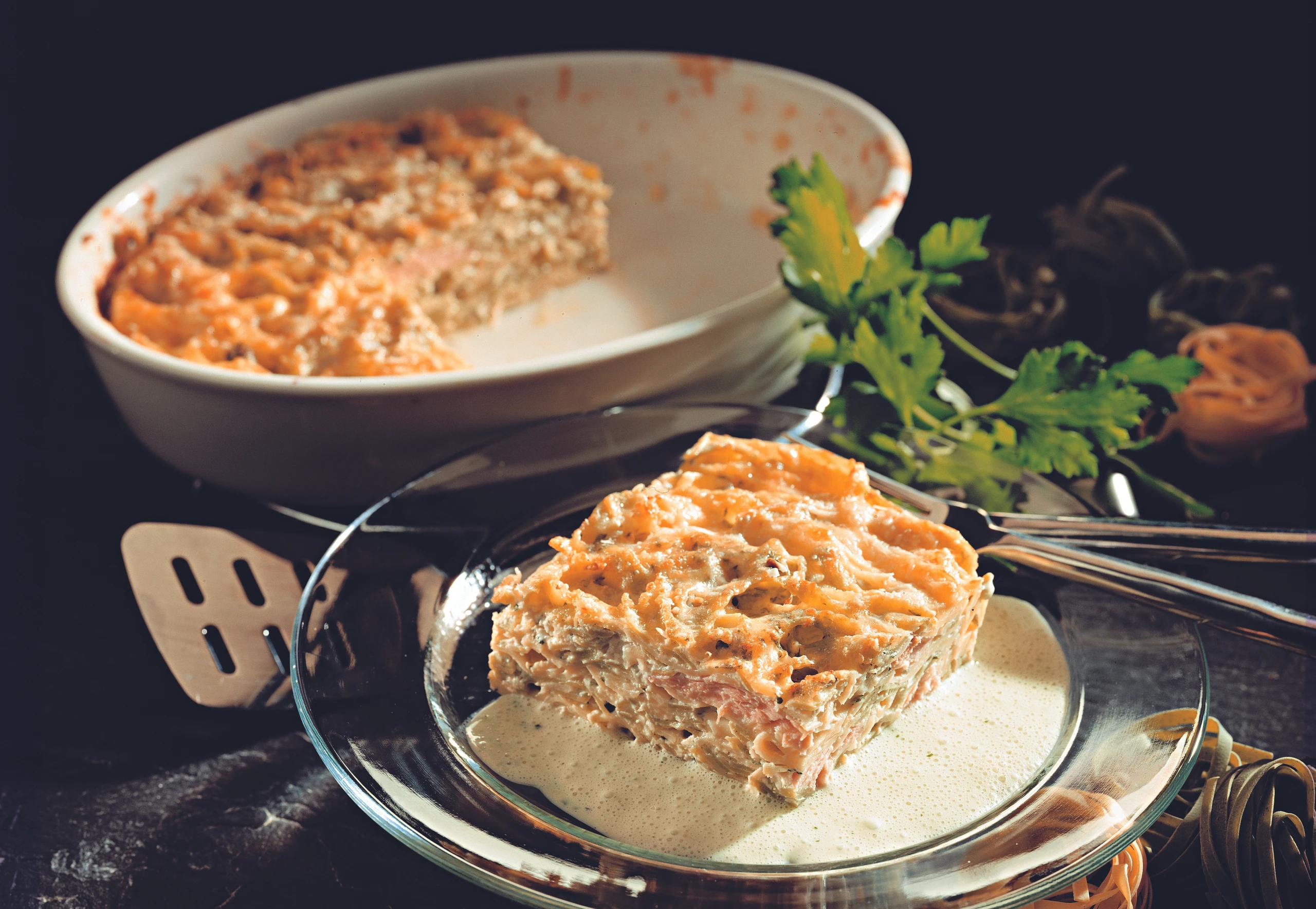 Nudeln mit der Rahm-Mischung und 100 g vom Parmesan vermengen. Die Hälfte der Nudelmasse in die Form füllen, mit den Lachsstreifen belegen und restliche Nudelmasse gleichmäßig darauf verteilen.