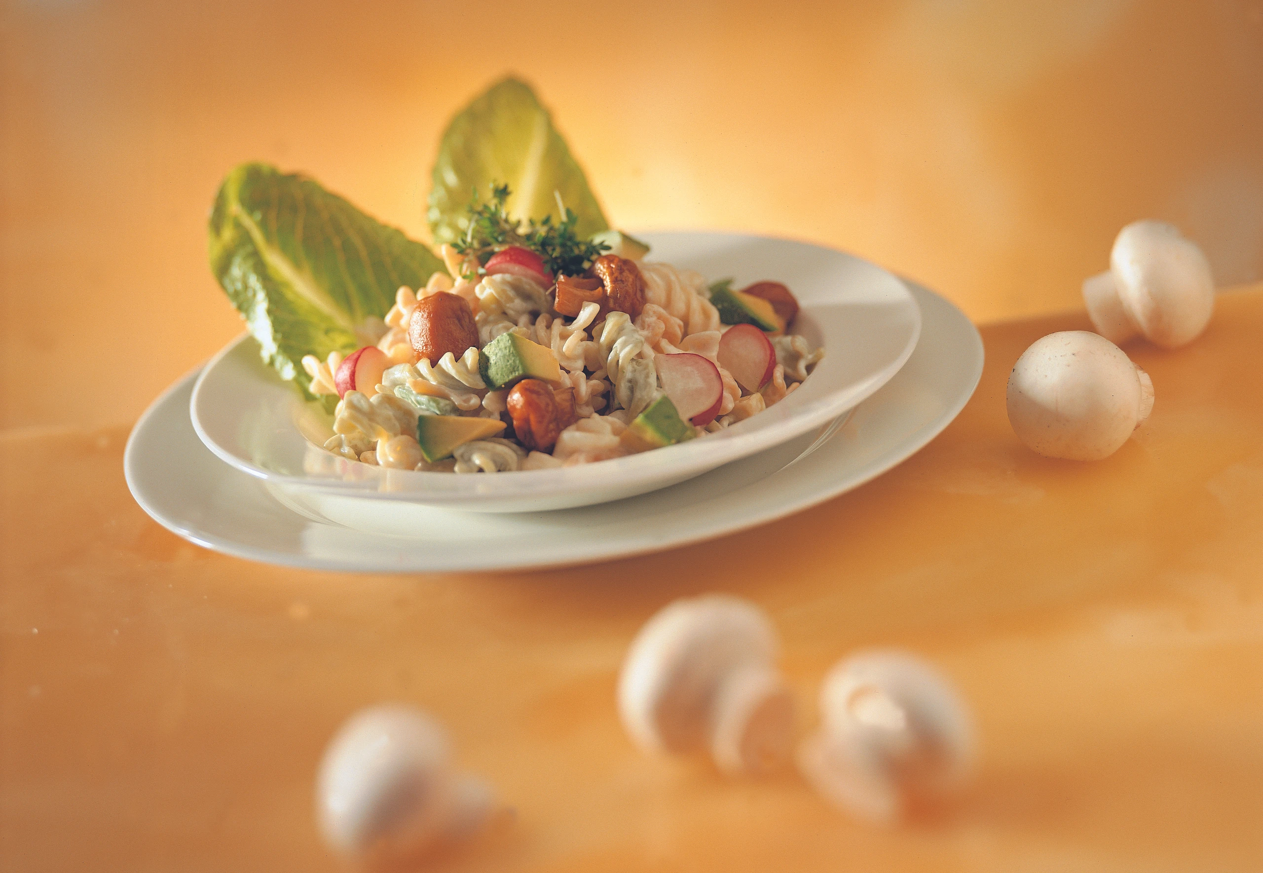 Sauerrahm mit Olivenöl, Zitronensaft, Salz, Pfeffer und zerdrücktem Knoblauch gut verrühren (Schneebesen). Nudeln, Radieschen, Champignons und Avocadostücke zugeben und mit einem Kochlöffel vorsichtig vermischen. Salat zudecken und vor dem Anrichten mindestens 10 Minuten bei Raumtemperatur ziehen lassen.
