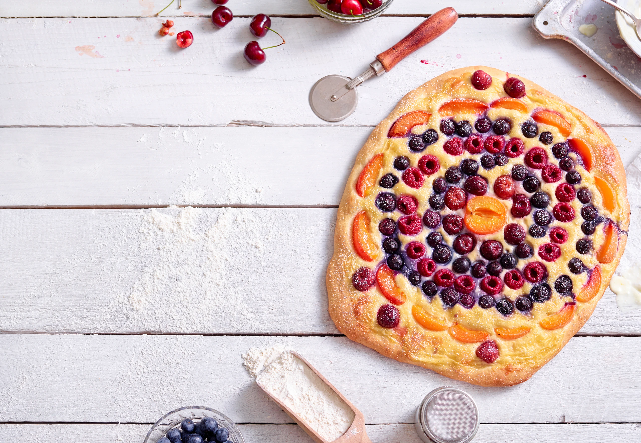 Rohr auf 180°C vorheizen. Backblech mit Backpapier belegen. Teig auf einer bemehlten Arbeitsfläche ausrollen und auf das Blech legen. Mit Creme bestreichen und mit Obst belegen. Im Rohr (mittlere Schiene) ca. 35 Minuten backen. Herausnehmen, abkühlen lassen und mit Staubzucker bestreuen.