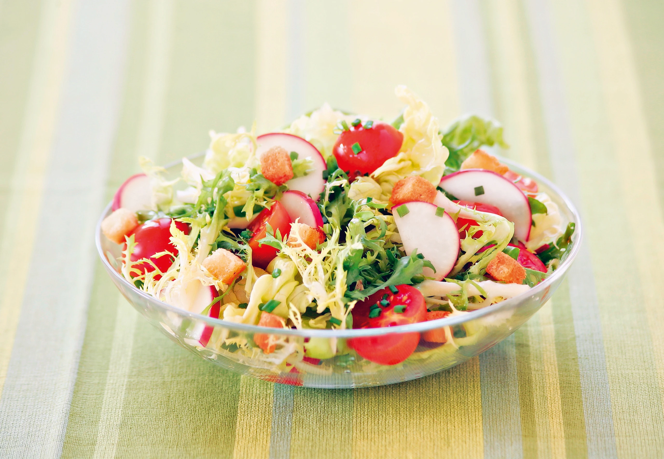 Salate, Paradeiser und Radieschen mit der Marinade vermischen und mit den Brotwürfeln bestreut servieren.