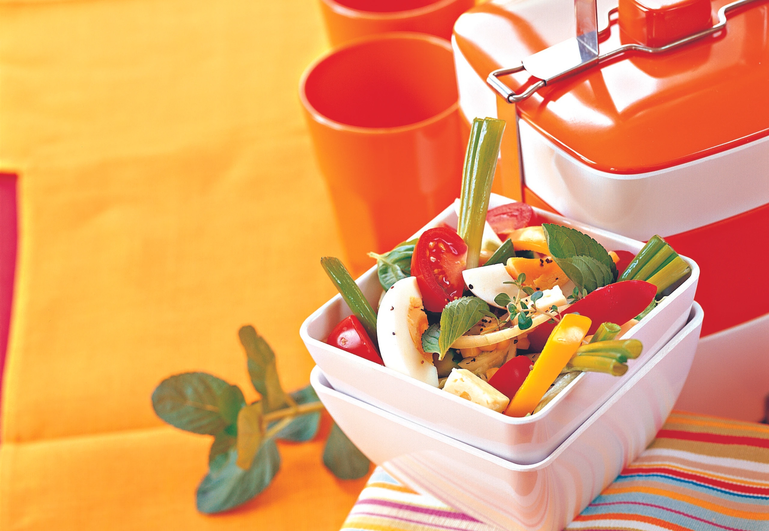 Mais in einem Sieb abtropfen lassen. Salat zerpflücken. Paradeiser in Spalten schneiden. Paprika putzen und in Streifen schneiden. Zwiebel schälen und in Ringe schneiden. Jungzwiebeln putzen und längs halbieren. Gurke längs vierteln und in Scheiben schneiden. Käse in Würfel schneiden.
