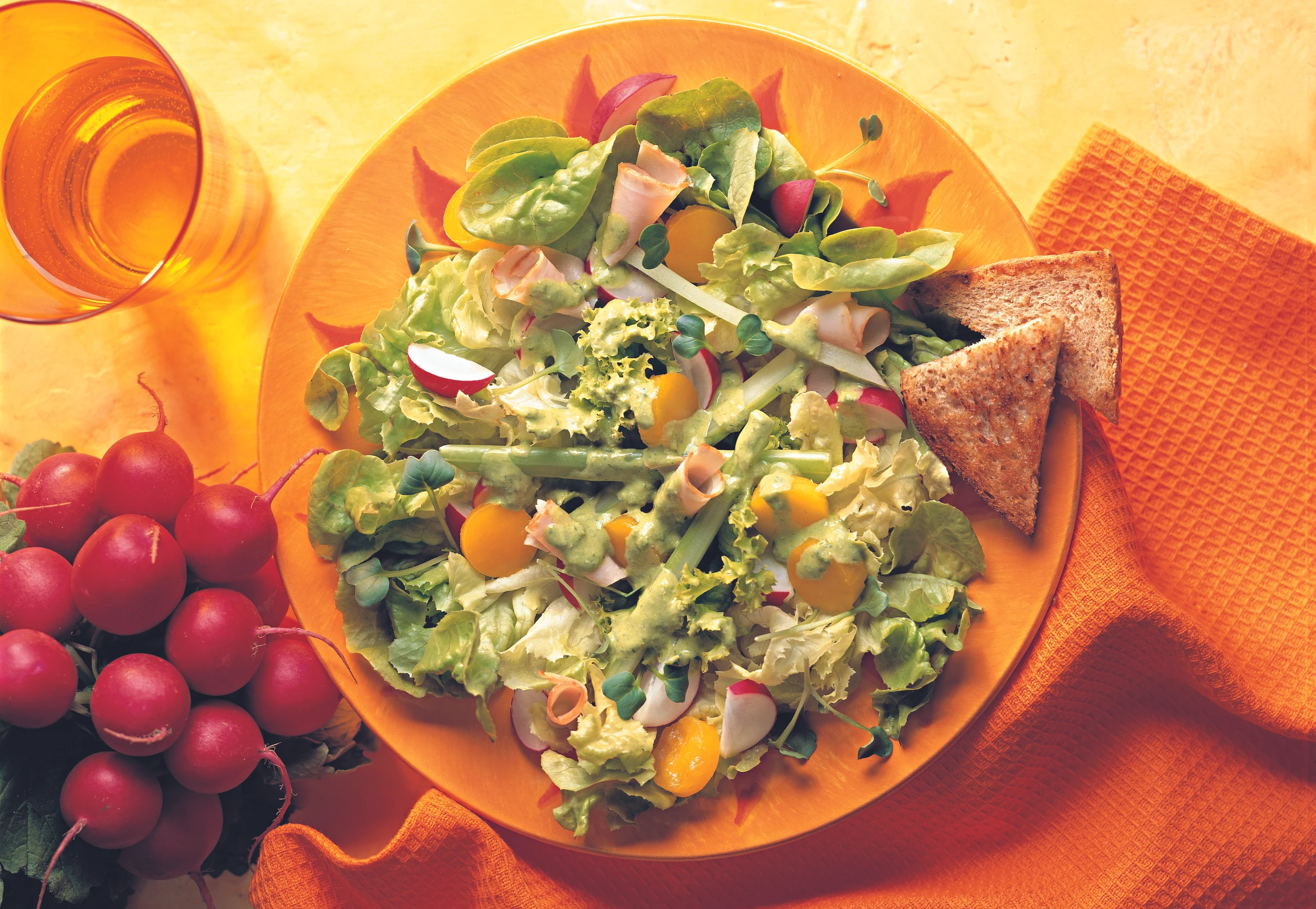 Salat portionsweise anrichten: Teller mit Salatblättern auslegen, darauf die Gemüse verteilen. Schinkenblätter zu kleinen Stanitzeln formen und auf den Salaten verteilen. Kresse von den Stielen schneiden und darüberstreuen. Die Kräutersauce gleichmäßig auf den Salaten verteilen. Dazu passen knusprig geröstete Vollkorntoasts.