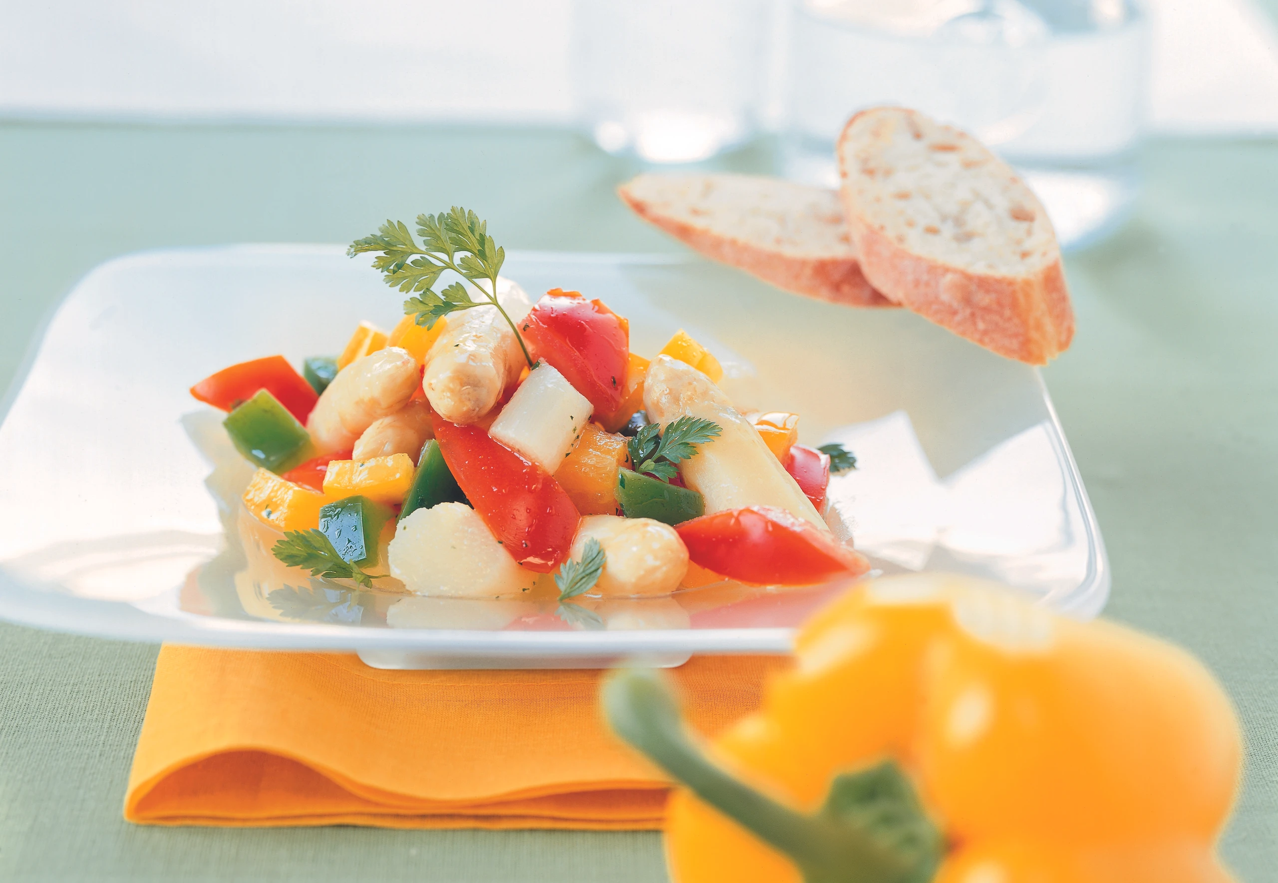Essig mit Öl und Spargelfond verrühren, mit Salz, Pfeffer, Zucker und ein paar Tropfen Zitronensaft würzen. Marinade mit Kräutern und Gemüse vermischen. Salat vor dem Anrichten ca. 20 Minuten ziehen lassen.