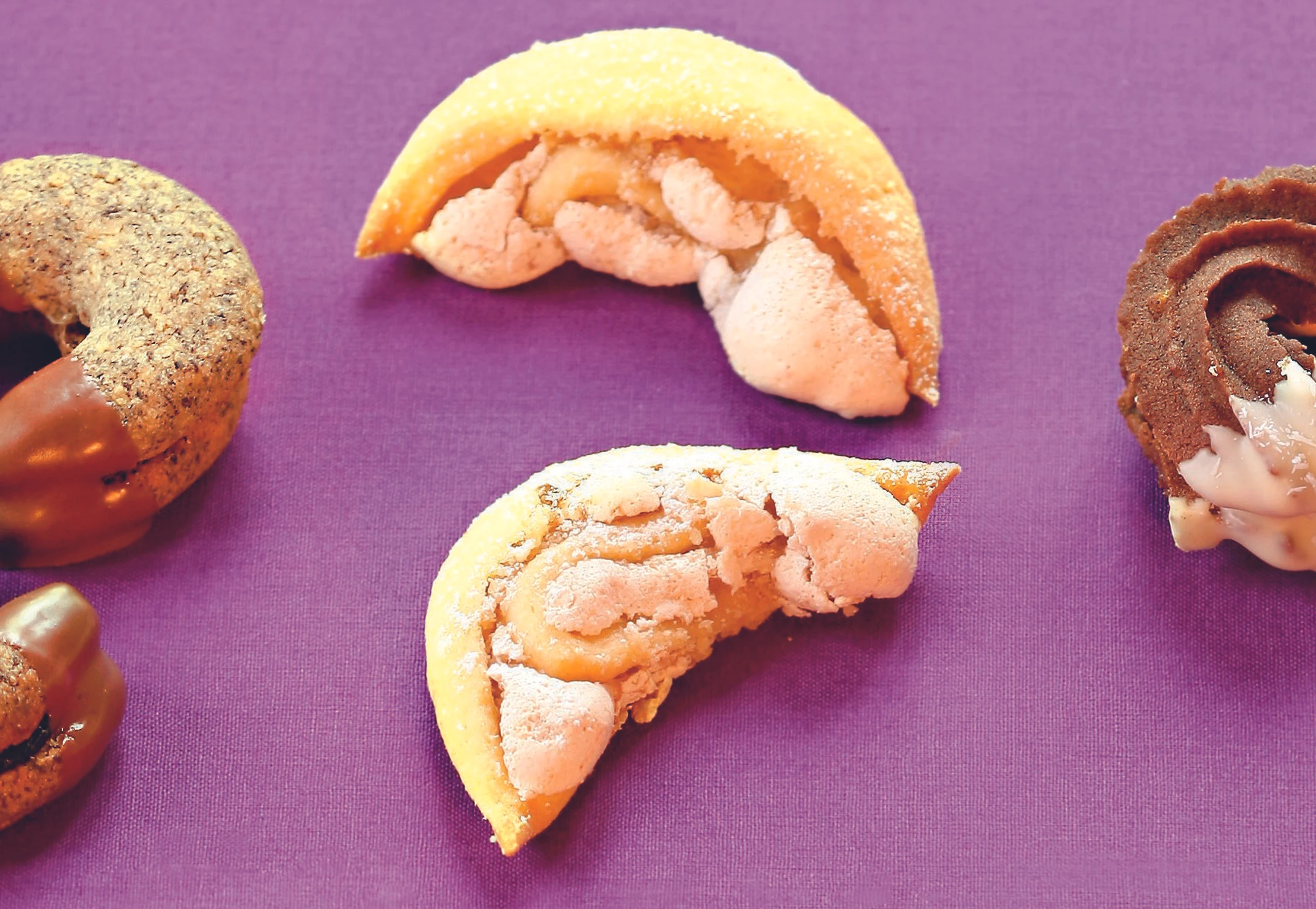 Teig vierteln, 3 mm dick (25 x 18 cm) ausrollen, mit Fülle bestreichen, mit Nüssen bestreuen und der Breite nach einrollen. Mit einem Ausstecher Halbmonde ausstechen, auf die Bleche legen und im Rohr (mittlere Schiene) 15 Minuten backen. Mit Staubzucker bestreuen.