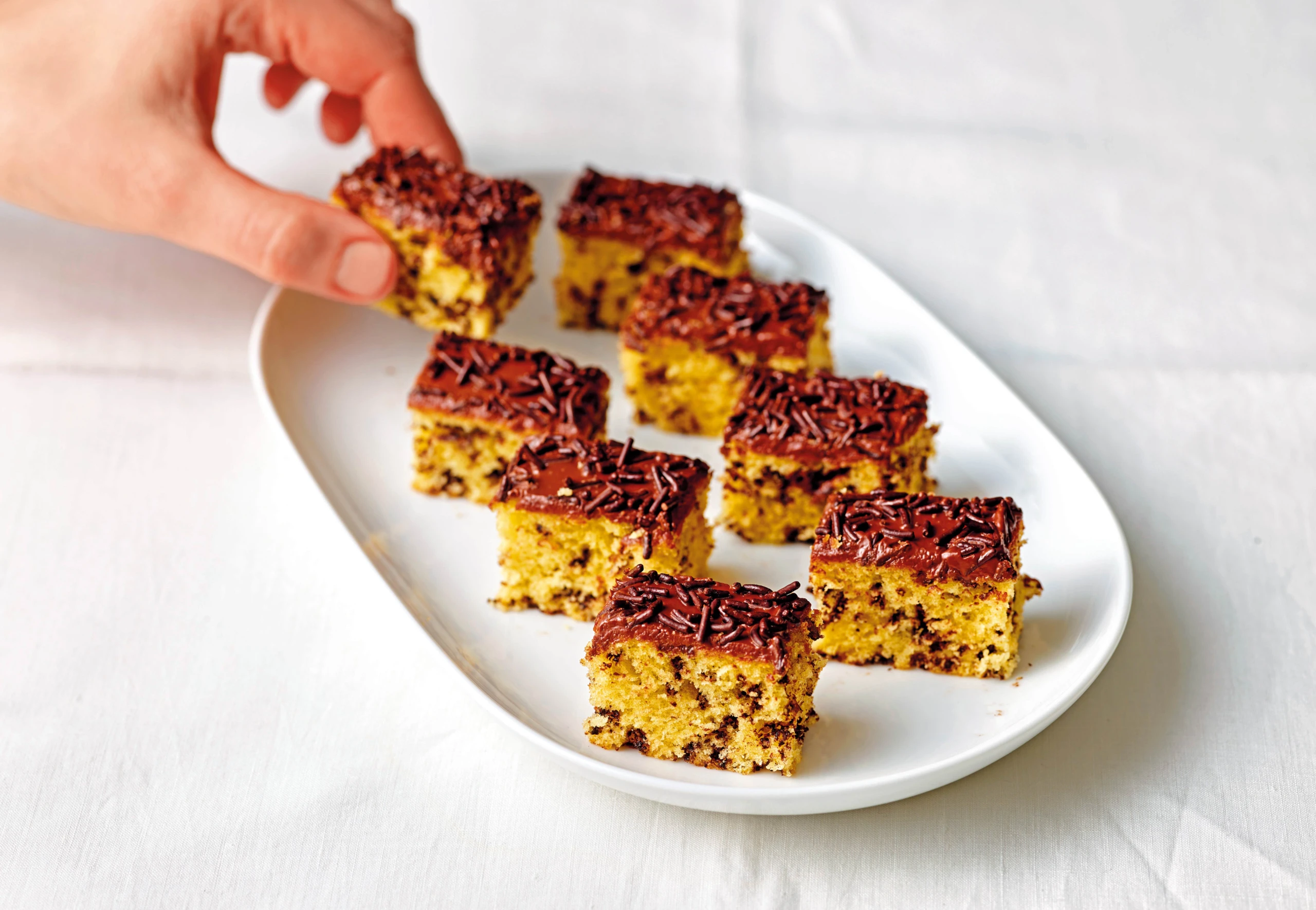 Für die Glasur Schokolade und Kokosfett über Wasserdampf schmelzen. Glasur glatt rühren und auf dem Kuchen gleichmäßig verstreichen. Kuchen mit Schokostreuseln bestreuen und in 4 x 2 cm große Stücke schneiden.
