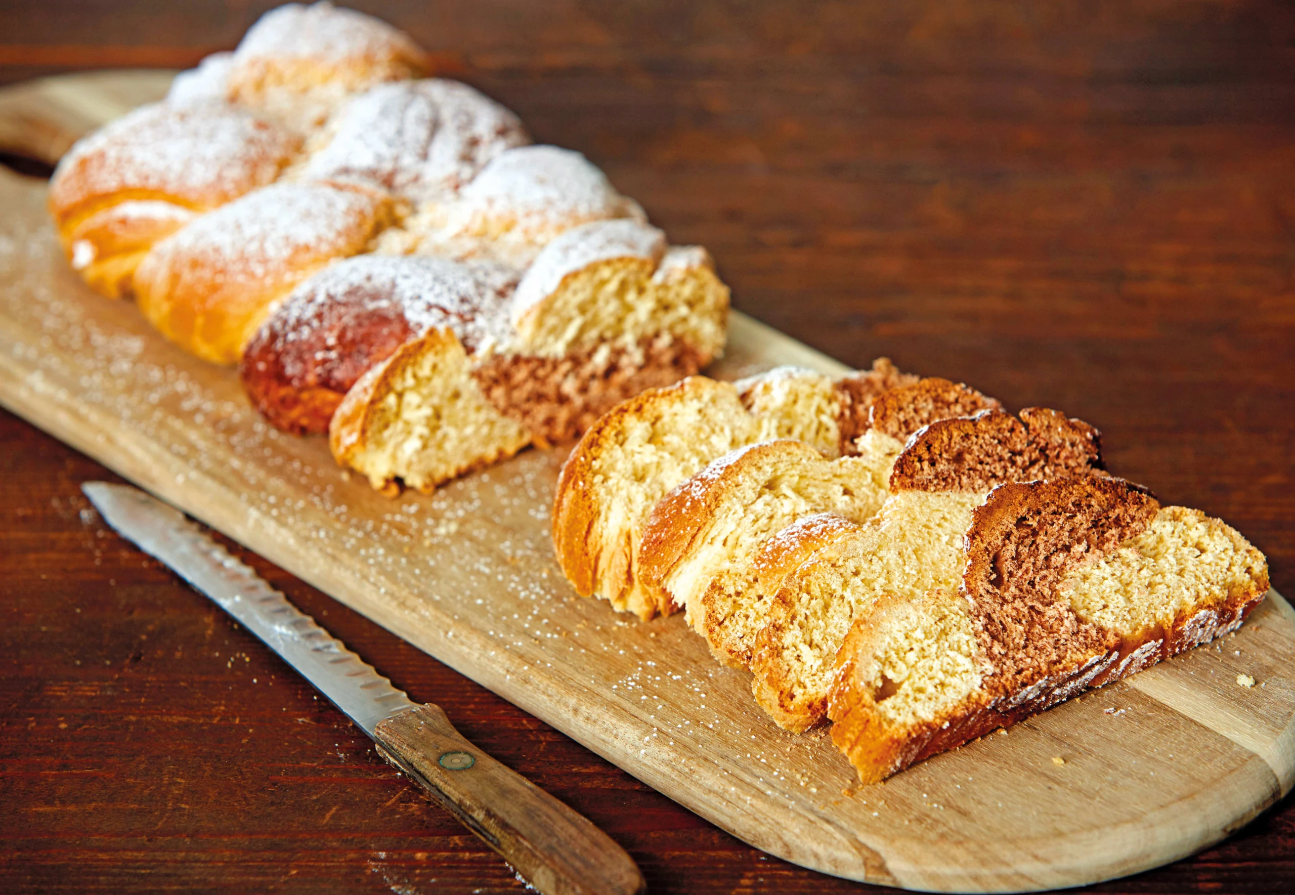 Teig auf einer bemehlten Arbeitsfläche zu drei gleich schweren Kugeln formen. Davon eine Kugel mit Schokoladecreme verkneten. Aus jeder Kugel eine längliche Rolle formen. Drei Enden zusammenzwicken. Teigstücke zu einem Striezel flechten.