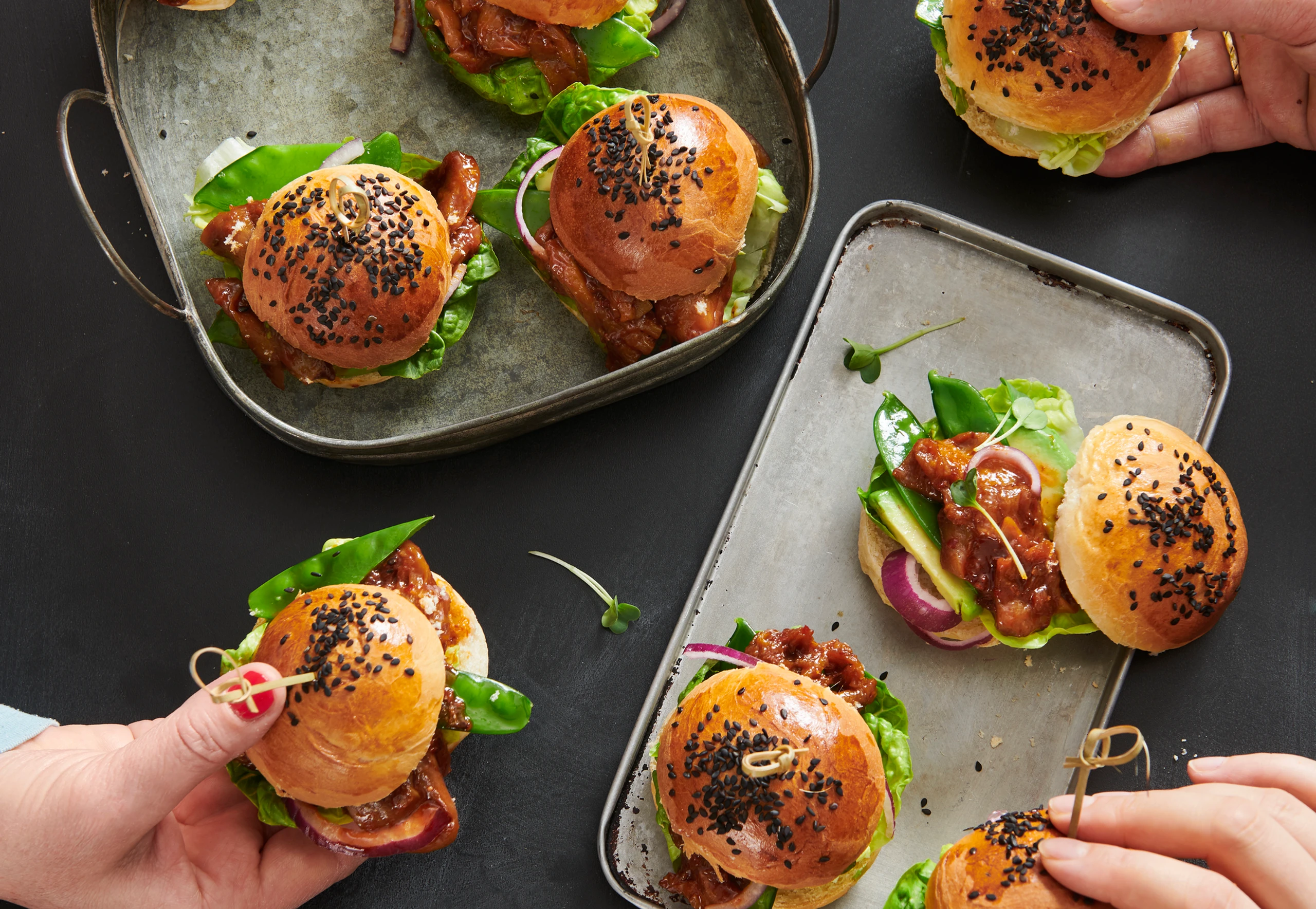 Buns durchschneiden. Böden mit Salat, Avocados, Jackfruchtmischung, Zuckerschoten und Zwiebeln belegen und mit Kresse bestreuen. Deckel darauf setzen.