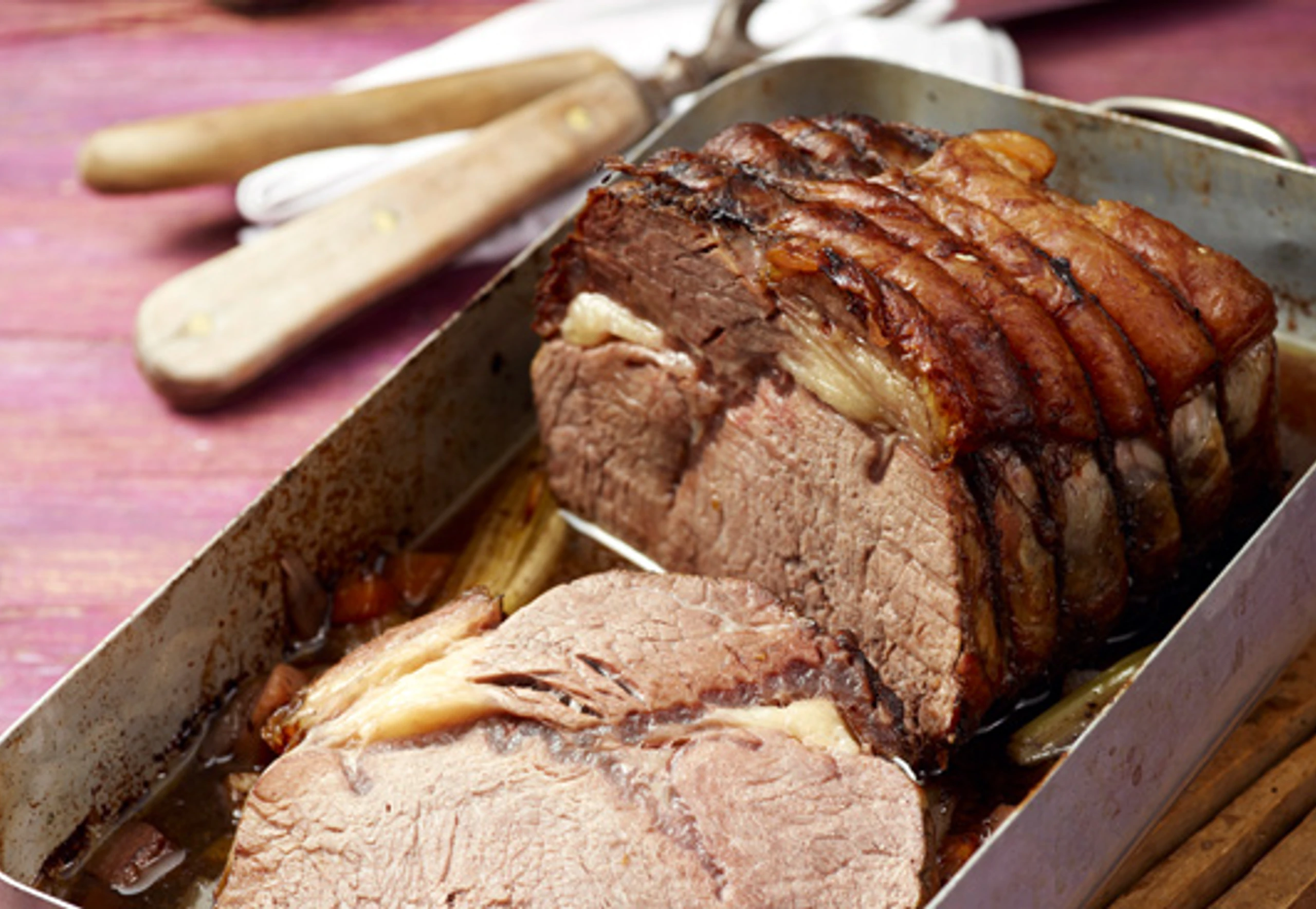 - Fleisch aus dem Rohr nehmen, portionieren und mit dem Gemüse und dem Bratensaft angerichtet servieren.