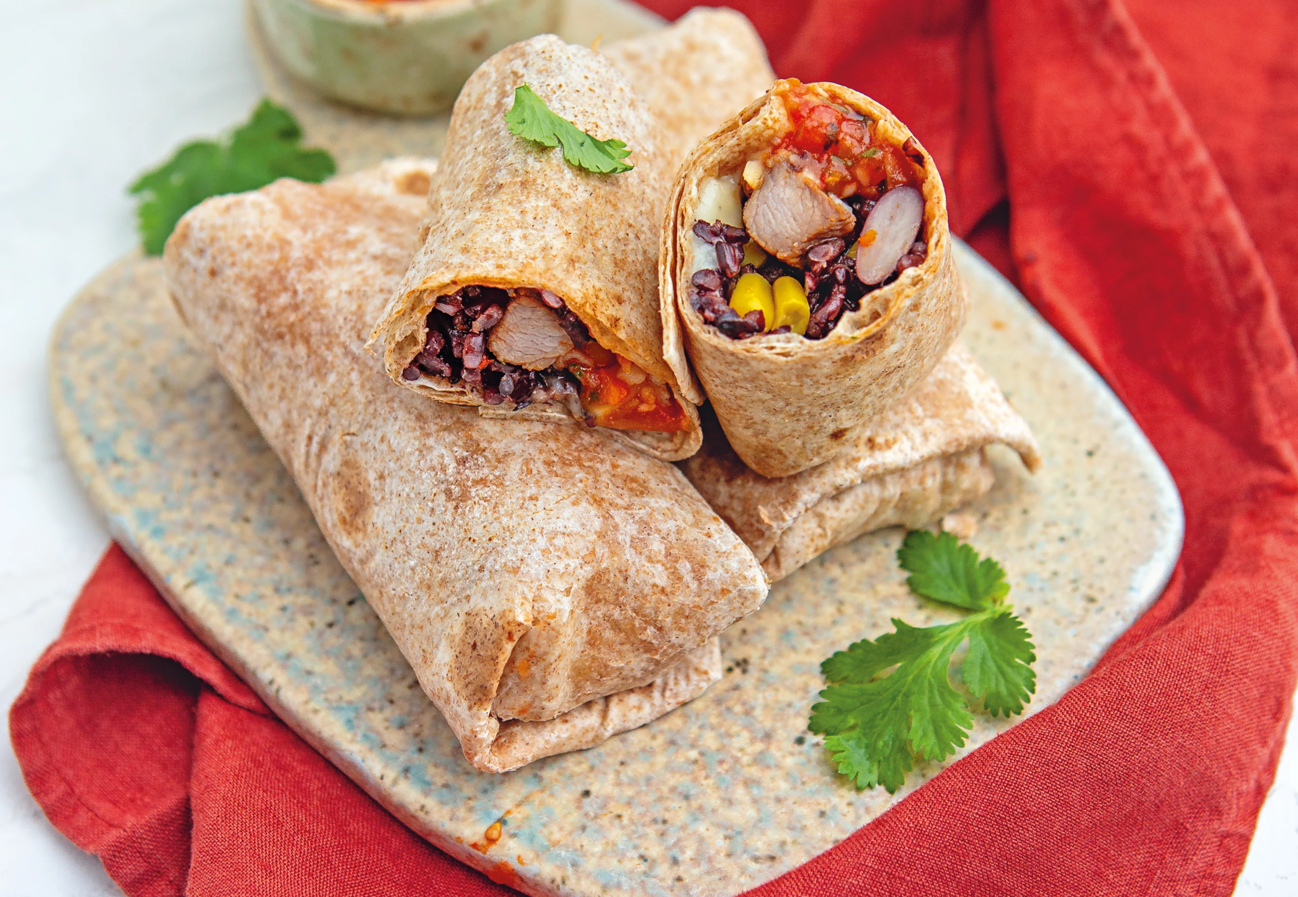 Weizentortillas in einer Pfanne ohne Öl kurz erhitzen. Tortillas mit Reis, Fleisch, Mais, Bohnen, Salsa und Mozzarella füllen. Eventuell mit Koriander und Limettenspalten garniert servieren.