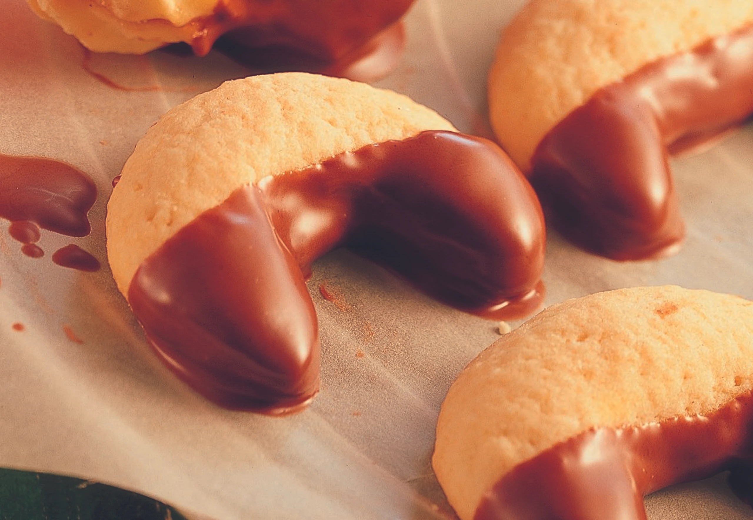Kipferln mit den Enden in Schokoladeglasur tauchen, abtropfen und auf Backpapier trocknen lassen.