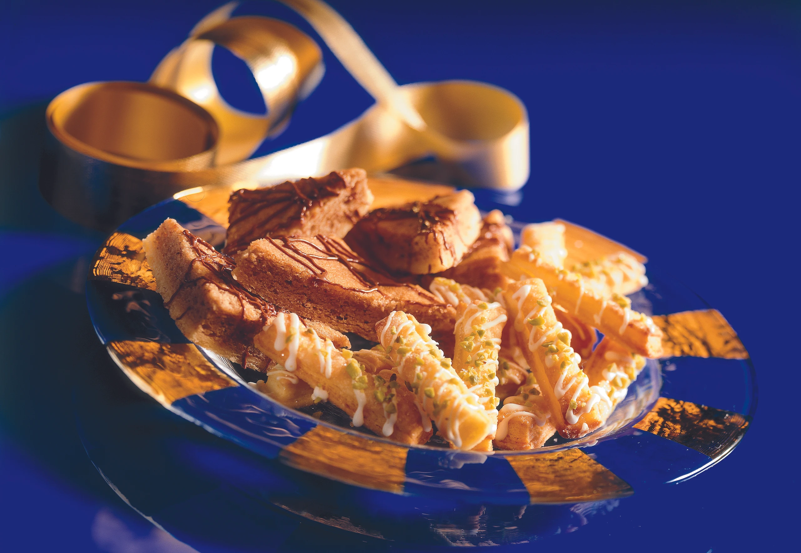 Eiklar mit Zucker und Zitronensaft verrühren. Glasur in ein kleines Stanitzel aus Pergament- oder Backpapier füllen und die Stangerl damit verzieren. Stangerl mit Pistazien bestreuen und die Glasur fest werden lassen.