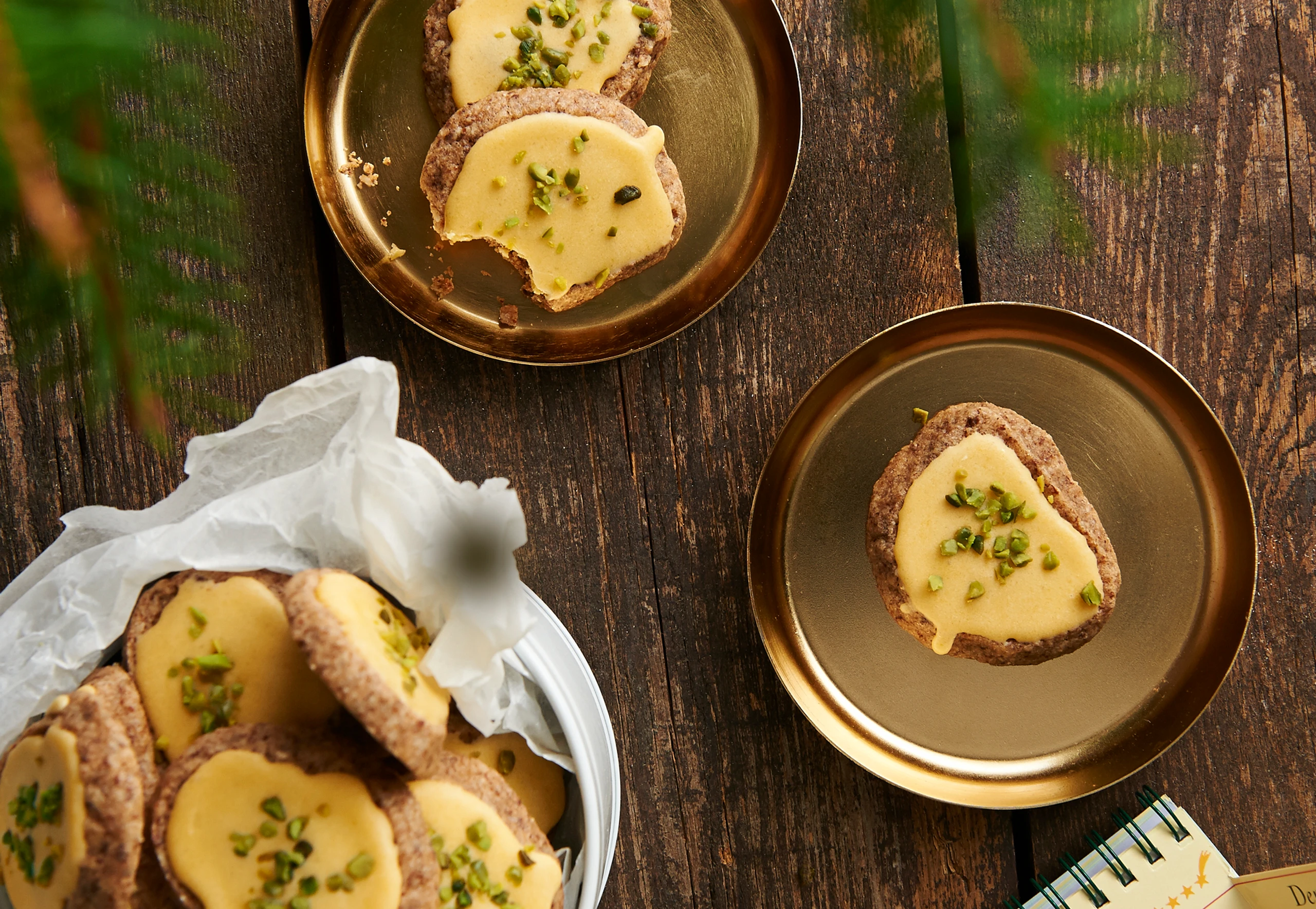 Für die Glasur Dotter und Staubzucker verrühren. Kekse damit bestreichen, mit Pistazien bestreuen und im Rohr bei 80°C ca. 10 Minuten trocknen lassen. Aus dem Rohr nehmen und abkühlen lassen.