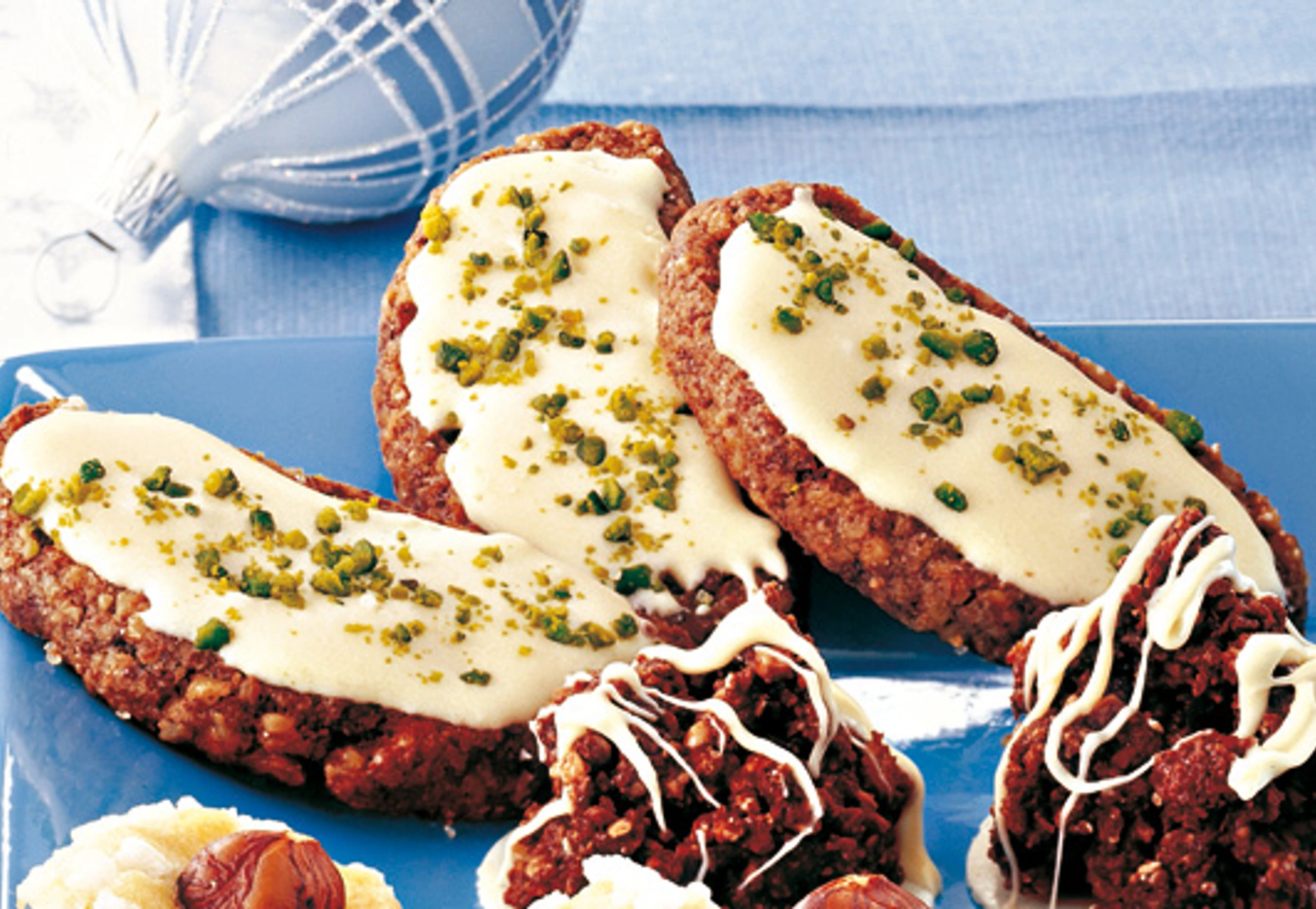 - Rohr auf 80°C vorheizen. Dotter mit Zucker, Vanillezucker und Zitronensaft verrühren, auf die Brote streichen, mit "Schnittlauch" (Pistazien) bestreuen. Brote im Rohr 8 Minuten trocknen lassen.