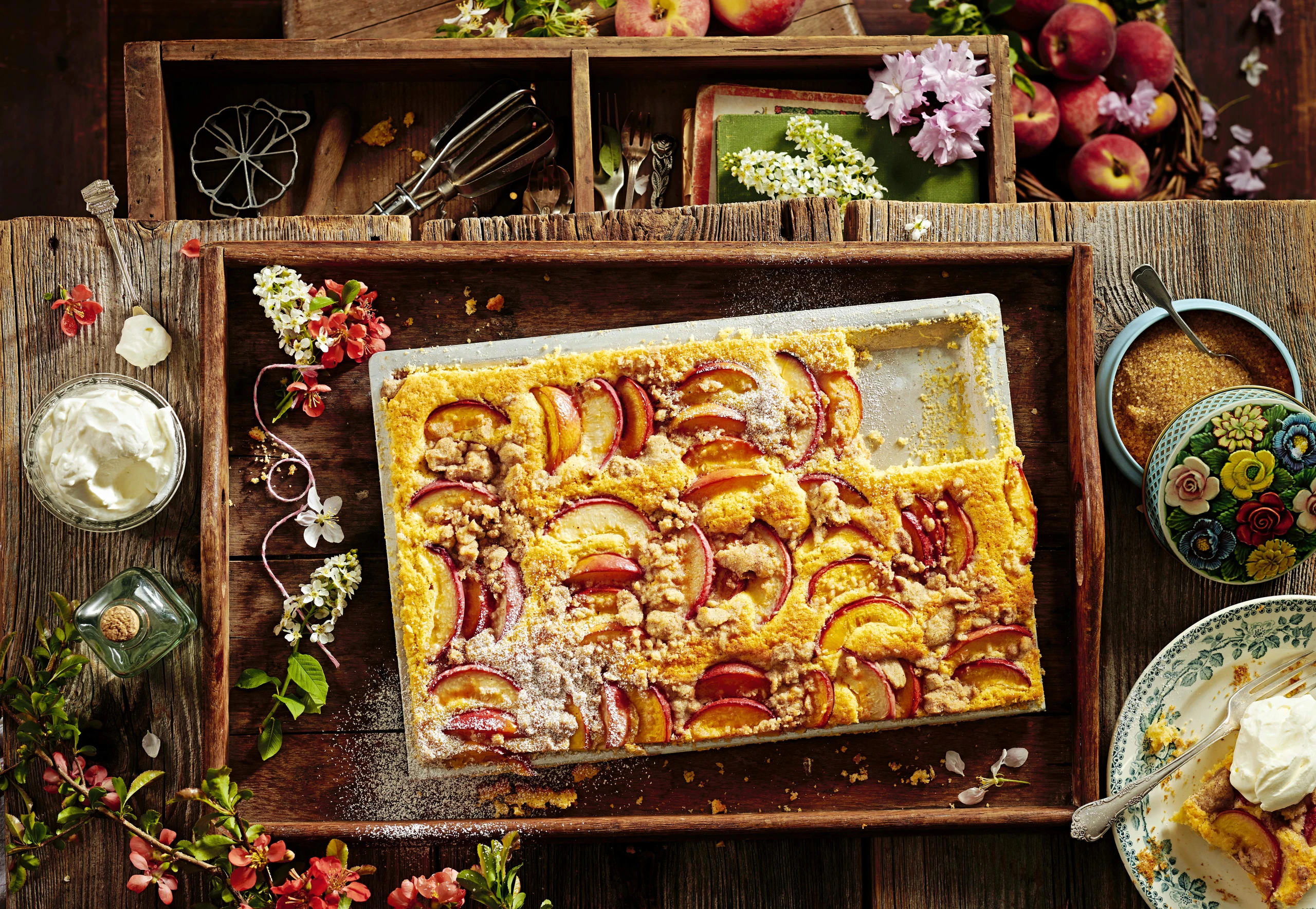 Buttermilch-Blechkuchen mit Nüssen und Pfirsichen