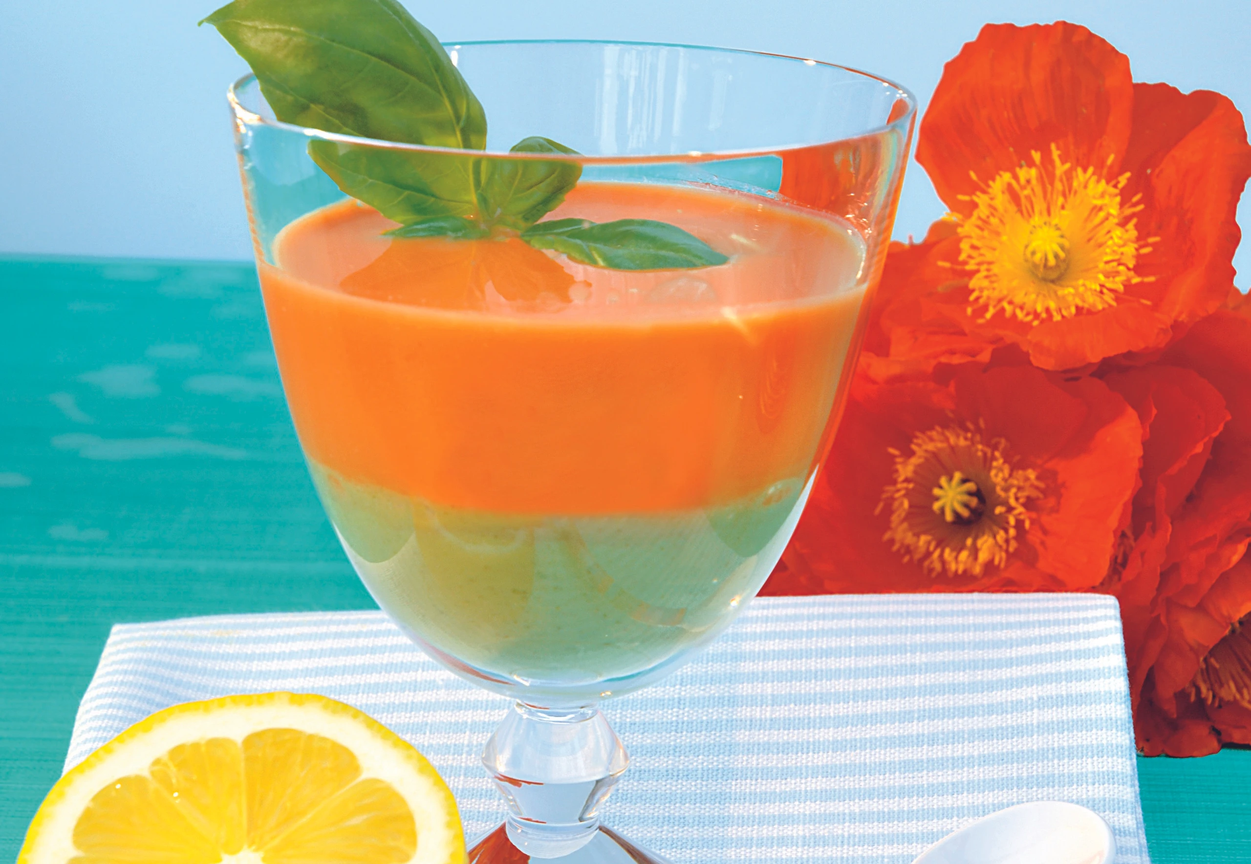 Joghurt-Basilikum-Mix in Gläser geben. Karotten-Buttermilch-Drink vorsichtig darüber gießen (Glas dabei schräg halten).