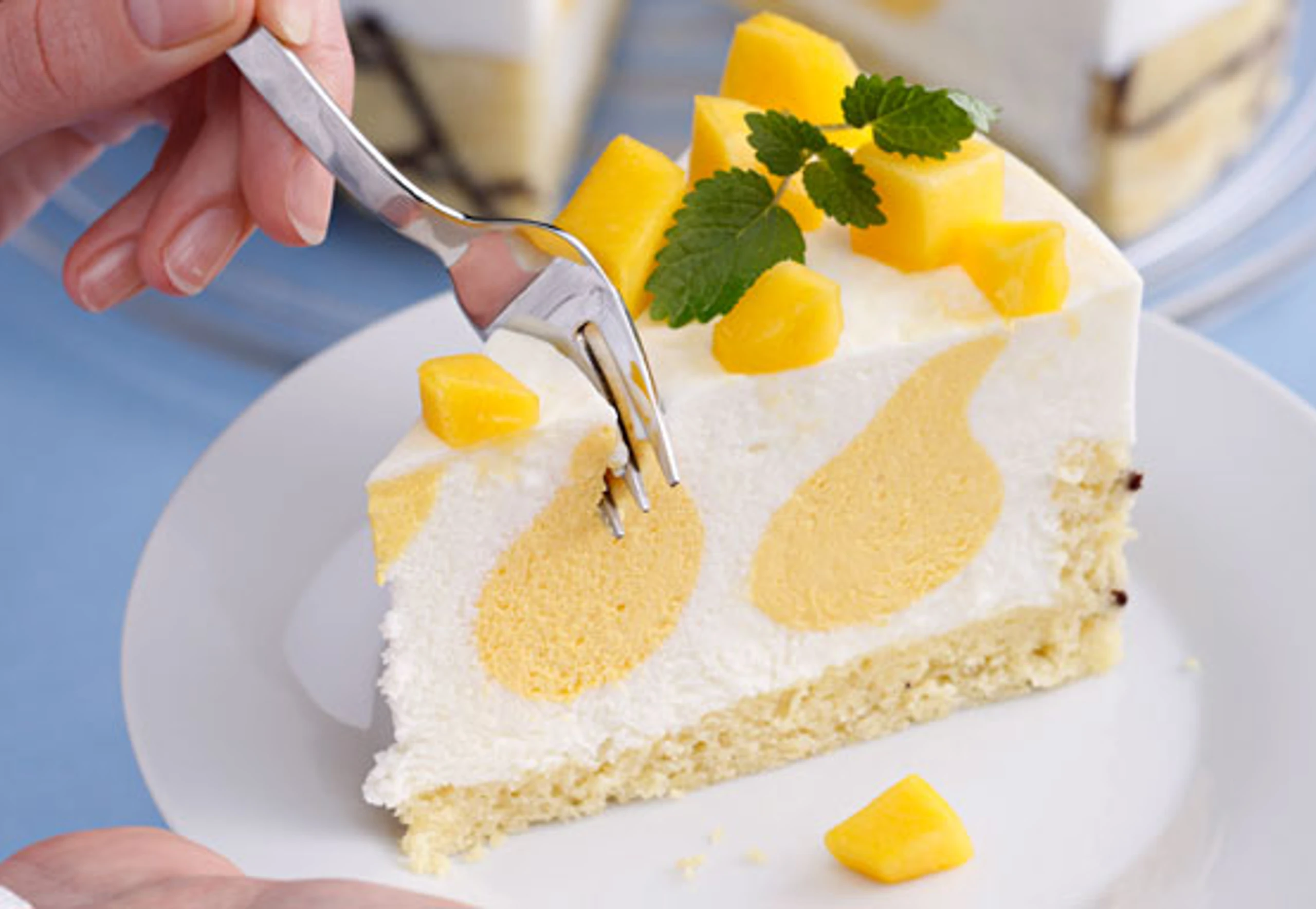 Für die Garnitur Mango schälen, entkernen und würfelig schneiden. Tortenring abheben, Torte mit Mangowürfeln und Melisseblättchen garnieren.
