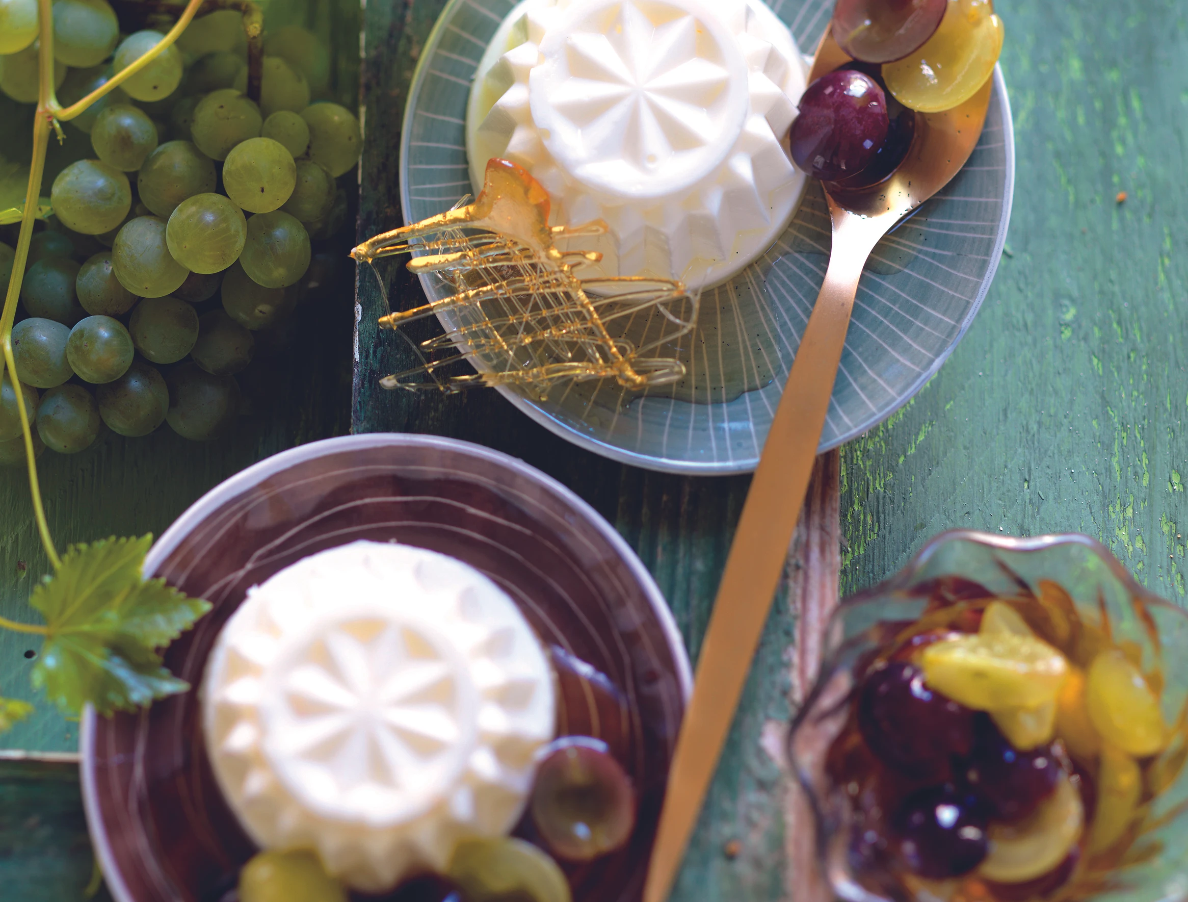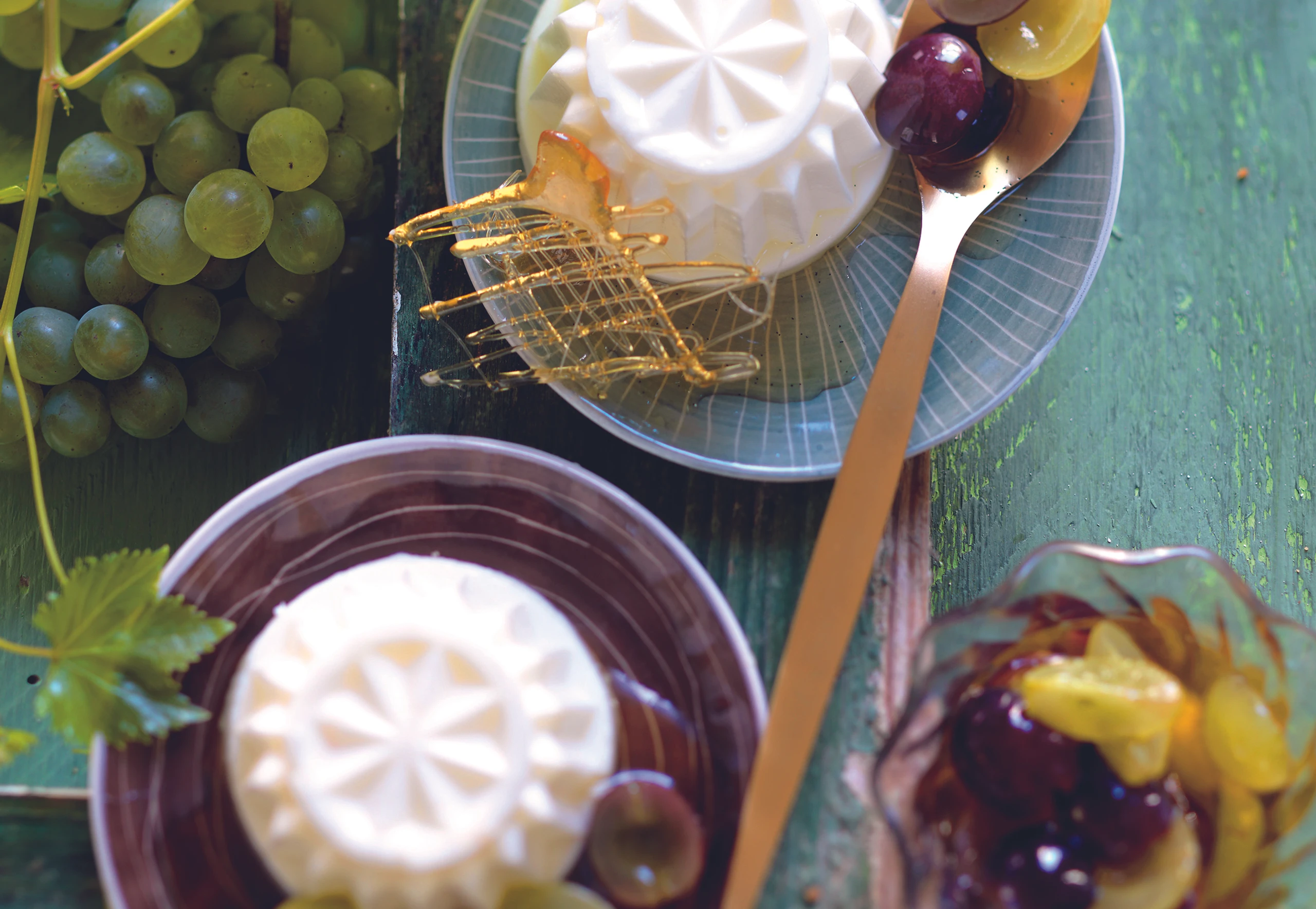 Förmchen in heißes Wasser tauchen, Mousse auf Teller stürzen und mit Trauben und Karamellgitter garnieren.