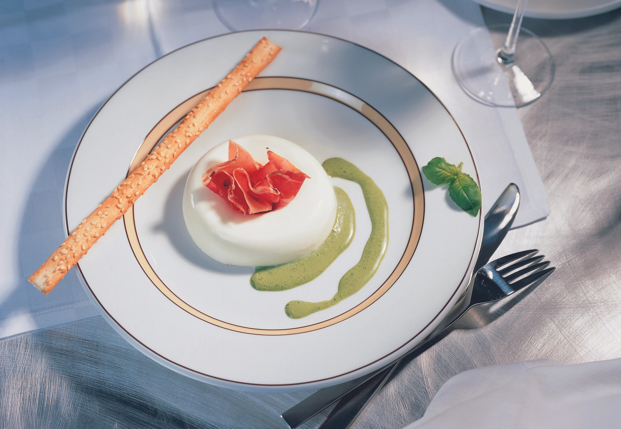 Zum Anrichten Förmchen kurz in heißes Wasser tauchen, das Mus auf Teller stürzen. Törtchen mit dem Schinken garnieren, mit Grissini und Basilikumsauce servieren.