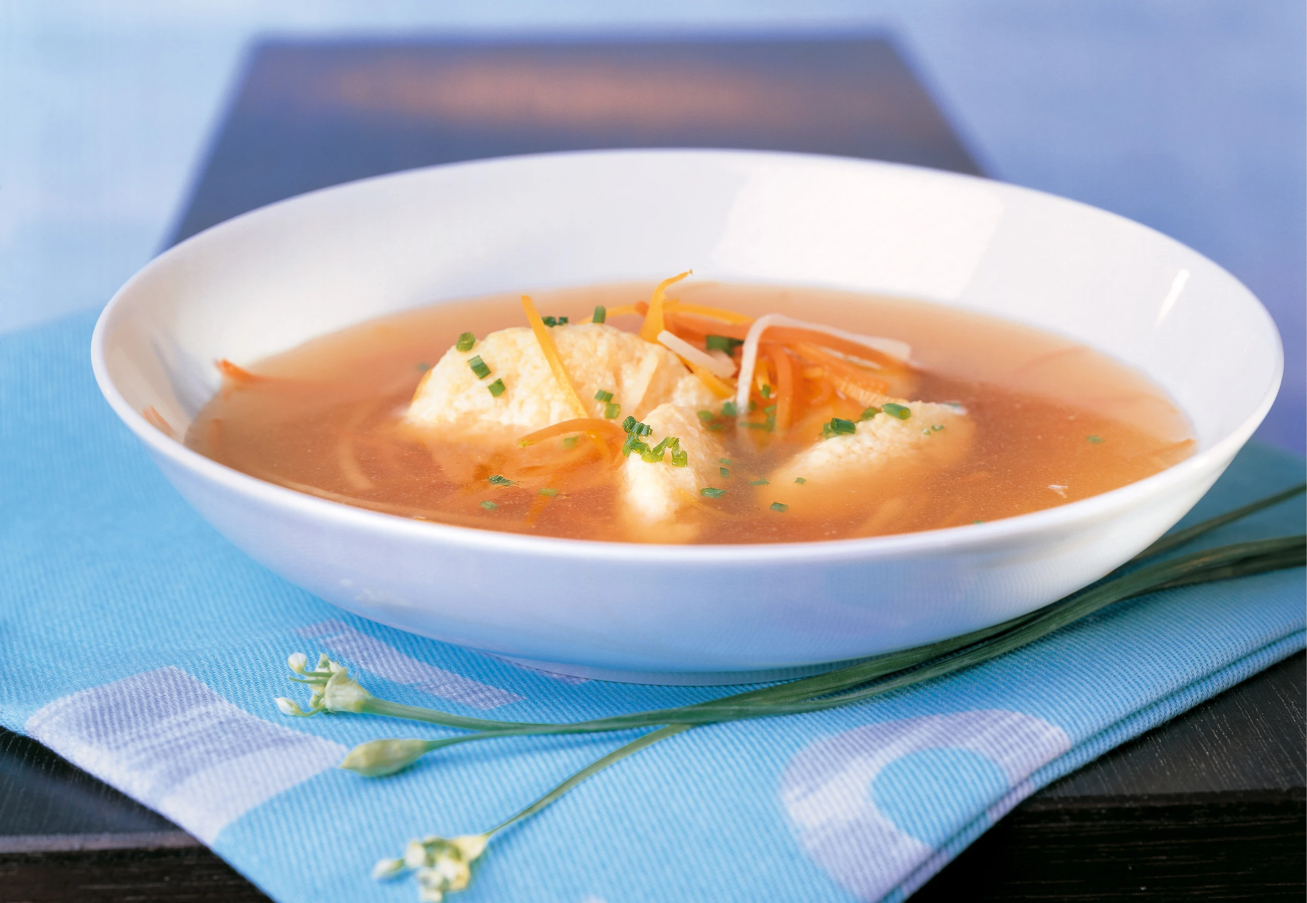 Klare Suppe aufkochen. Parallel dazu Salzwasser aufkochen, mit einem kleinen Löffel Nockerl ausstechen und ins Wasser geben. Nockerl aufkochen, vom Herd nehmen und zugedeckt 10 Minuten ziehen lassen.