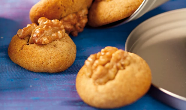 - Rohr auf 180°C vorheizen, Backblech mit Butter bestreichen. Teig in kleine Stücke teilen und Kugeln formen. In jede Kugel einen halben Walnusskern drücken.