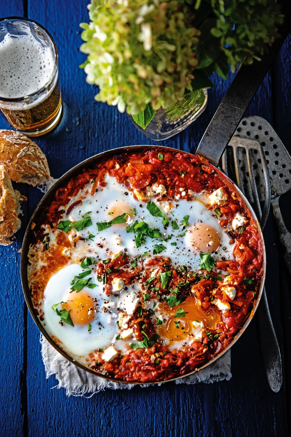 Feta in die Sauce rühren. In die Sauce mit einem Löffel Vertiefungen drücken und die Eier behutsam hineingleiten lassen. Shakshuka im Rohr (mittlere Schiene / Gitterrost) ca. 10 Minuten backen. Shakshuka salzen, pfeffern und mit übriger Petersilie bestreut servieren.