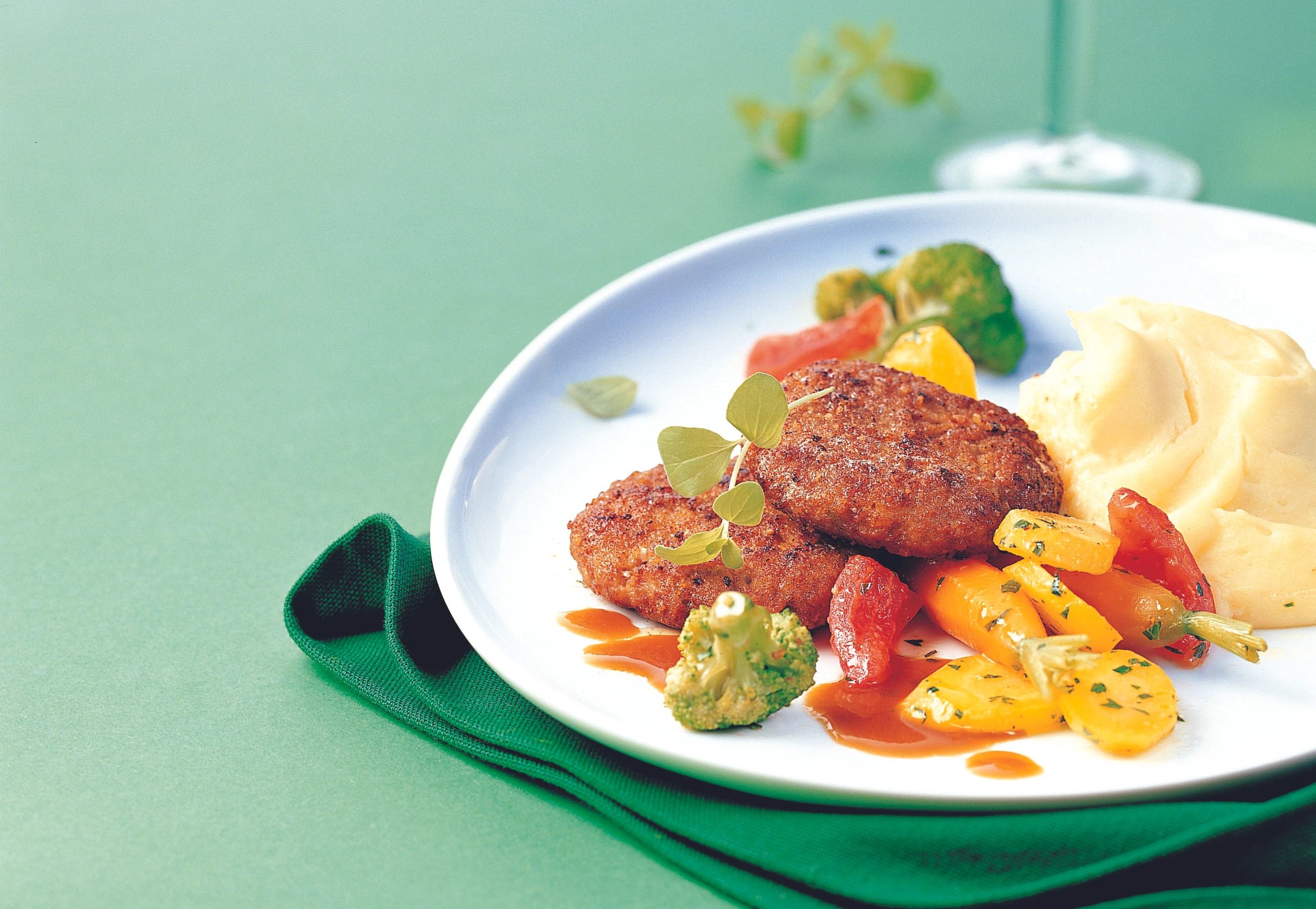 - Aus dem Faschierten 8 ca. 1 cm dicke Laibchen formen. Laibchen in Mehl wenden, in wenig Öl beidseitig goldgelb backen und auf Küchenpapier abtropfen lassen. Laibchen mit Püree und evtl. zusätzlich mit bissfest gedämpftem Gemüse, wie z.B. Karotten, Gelbe Rüben, Brokkoli sowie mit blanchierten, enthäuteten, in Würfel geschnittenen Paradeisern anrichten.