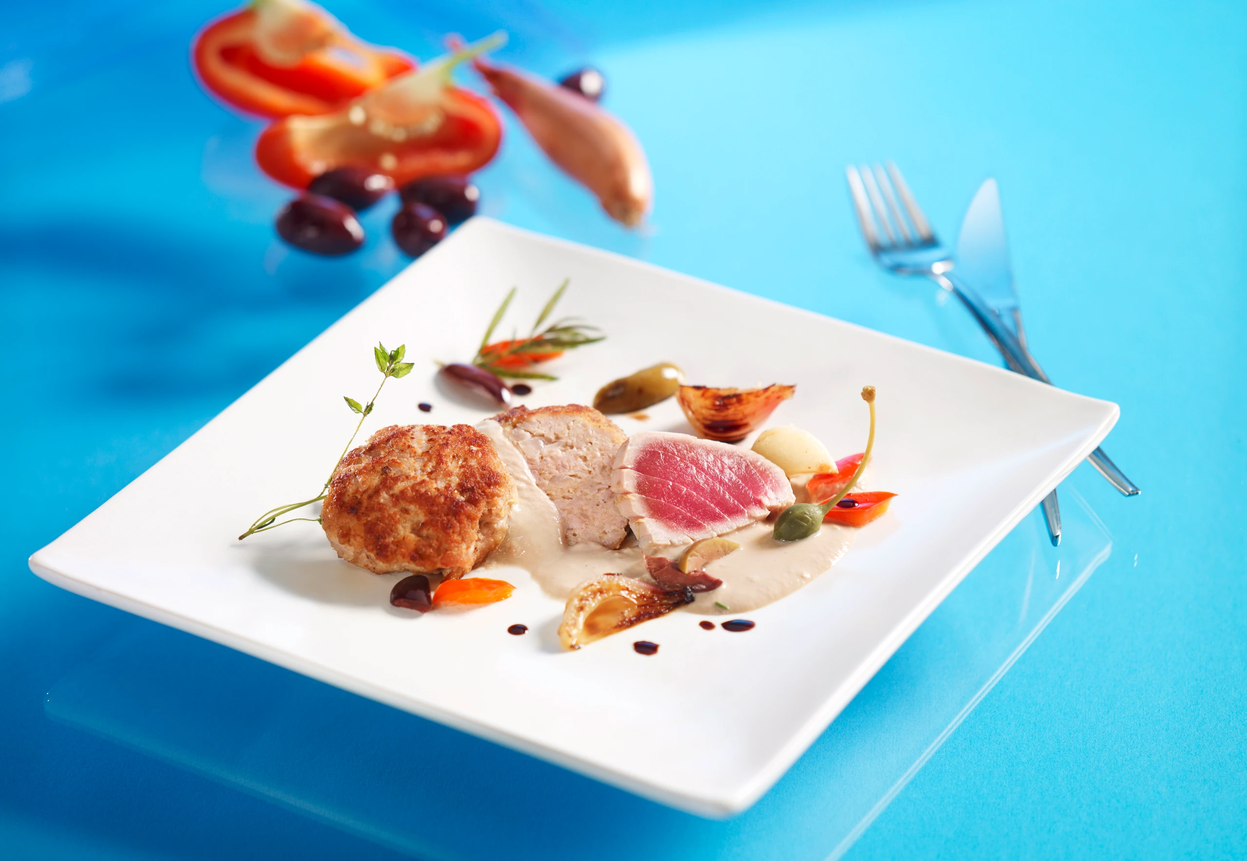 Thunfischsteak in Scheiben schneiden. Butter-schnitzerln mit dem Steak, der Sauce und dem Schmorgemüse anrichten.