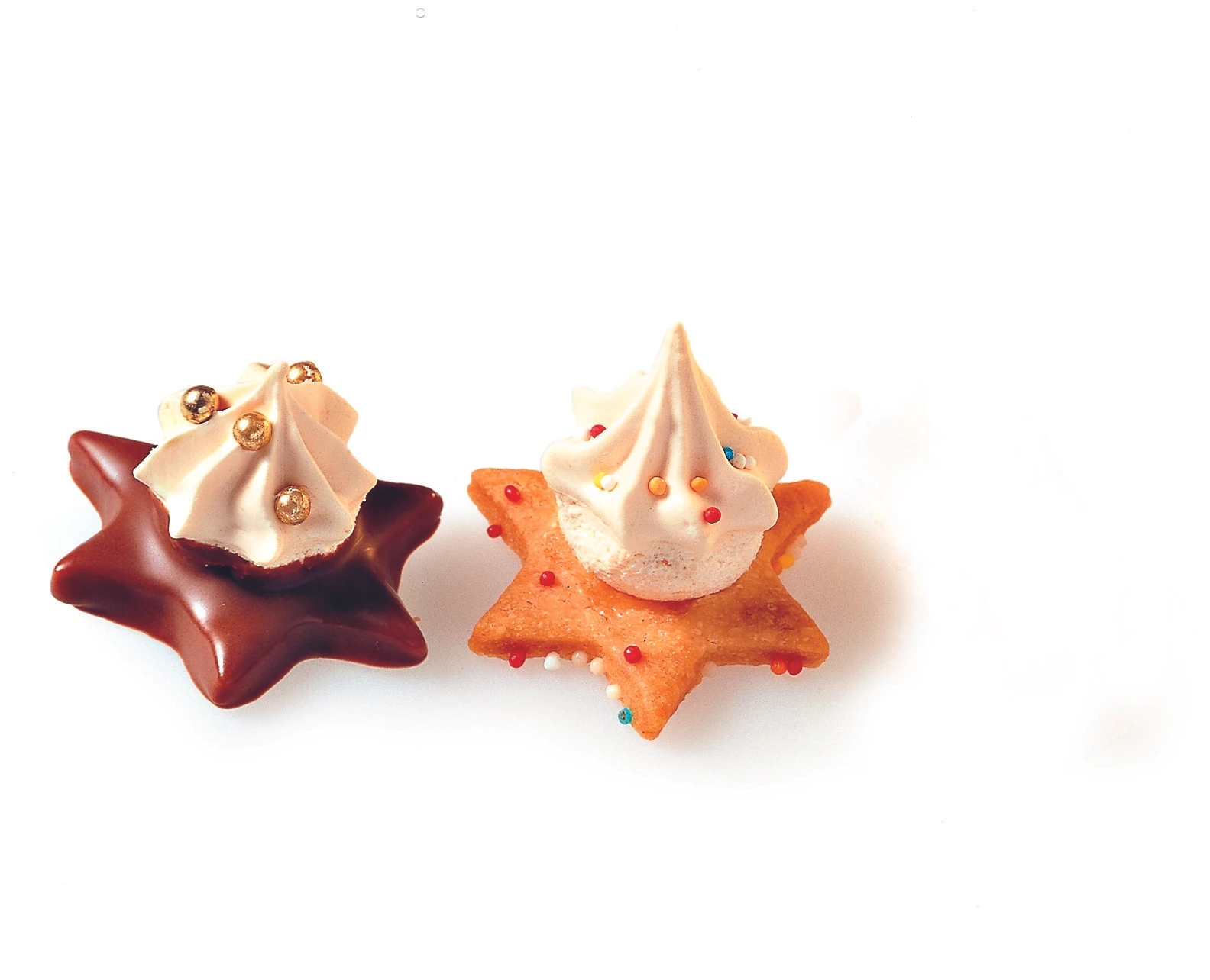 Rohr auf 160 °C vorheizen. Eiklar mit Staubzucker zu steifem Schnee schlagen. Masse in einen Dressiersack füllen und Rosetten auf die Buttersterne dressieren. Sterne mit buntem Streusel oder goldenen Zuckerkugeln bestreuen und im Rohr (mittlere Schiene) ca. 15 Minuten backen.