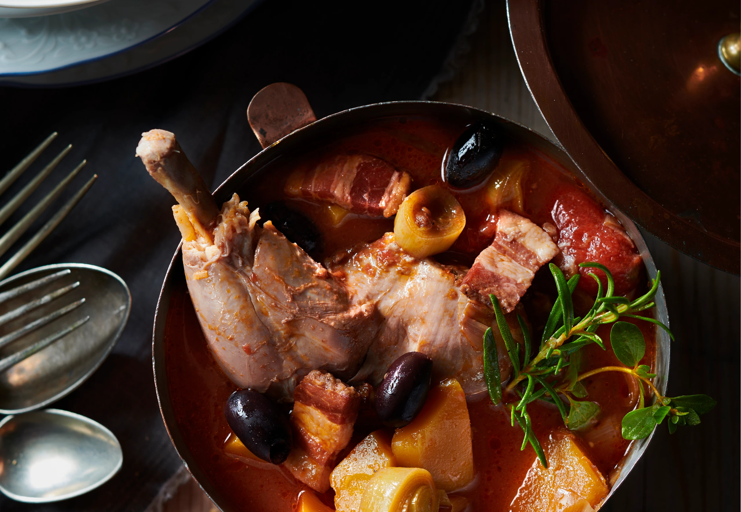 Kürbis schälen, entkernen, in mundgerechte Stücke schneiden und mit den Hühnerschenkel in den Topf geben. Chianti zuleeren und ca. 3 Minuten reduzieren lassen. Pelati zugeben und mit einem Kochlöffel ein wenig zerstückeln. Pelatidosen mit etwas Wasser füllen, schwenken und in den Topf leeren. Oliven in den Eintopf geben. Topf zudecken und ins Rohr stellen. Cacciatore ca. 1 Stunde schmoren, bis das Fleisch vom Knochen fällt und der Kürbis weich ist. Cacciatore mit Salz und Pfeffer abschmecken. Dazu passt Weißbrot.