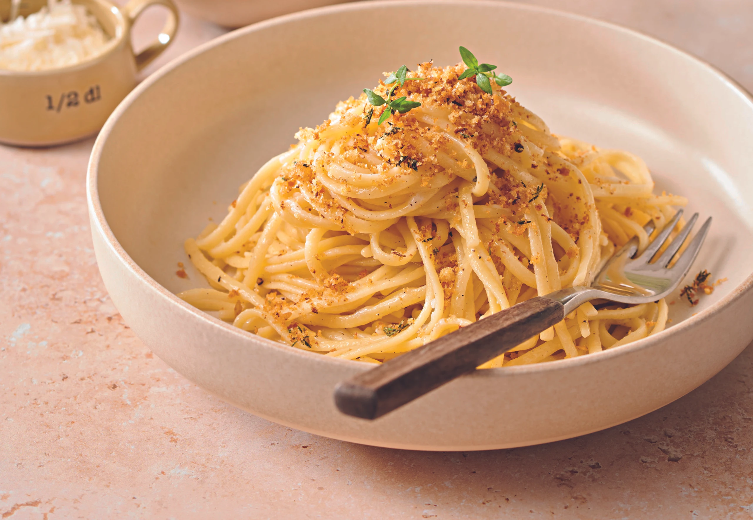 Cacio e pepe mit dem Pangrattato bestreut servieren.