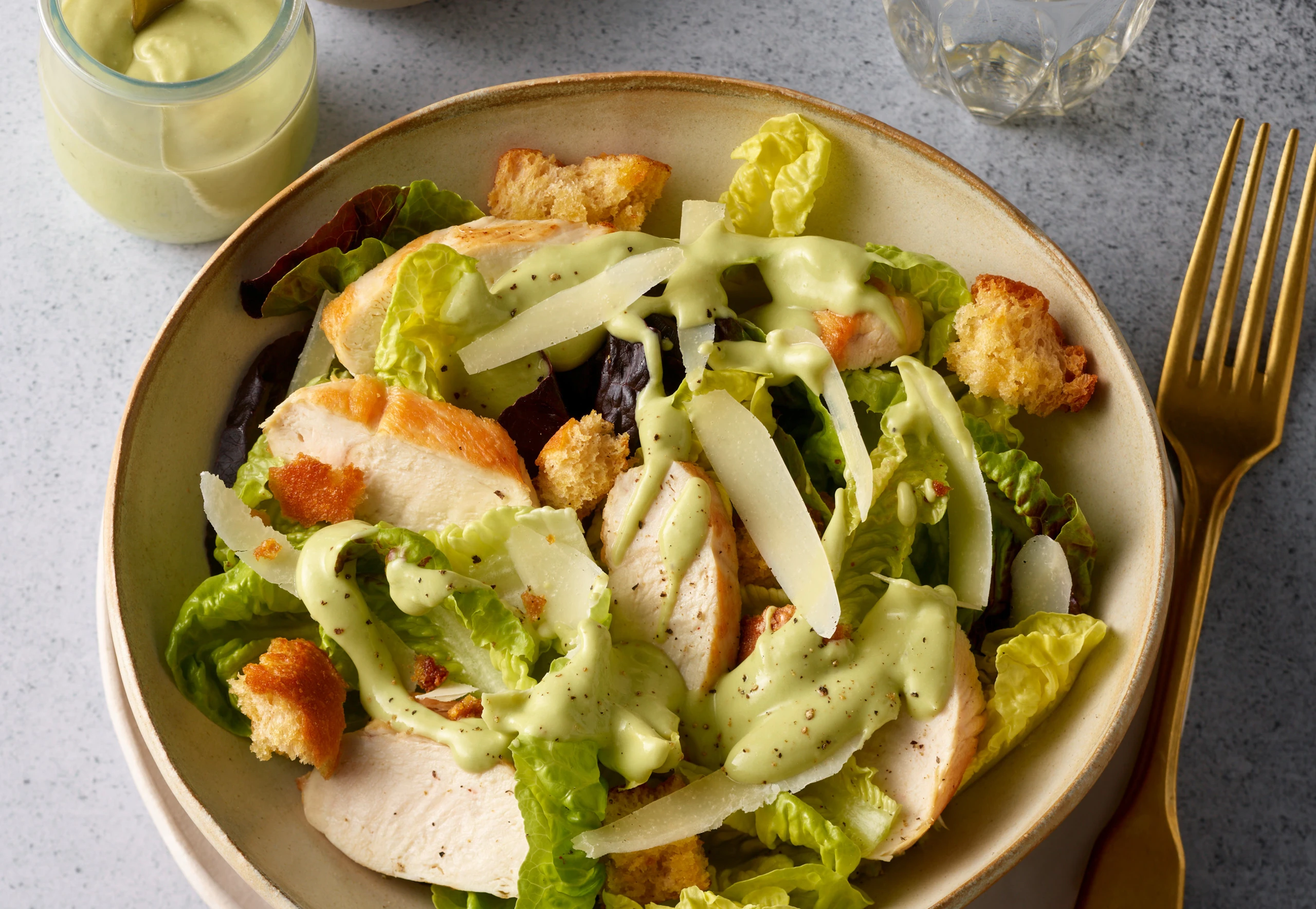 Salat zerteilen, mit Croûtons und Fleisch anrichten, mit dem Dressing beträufeln.