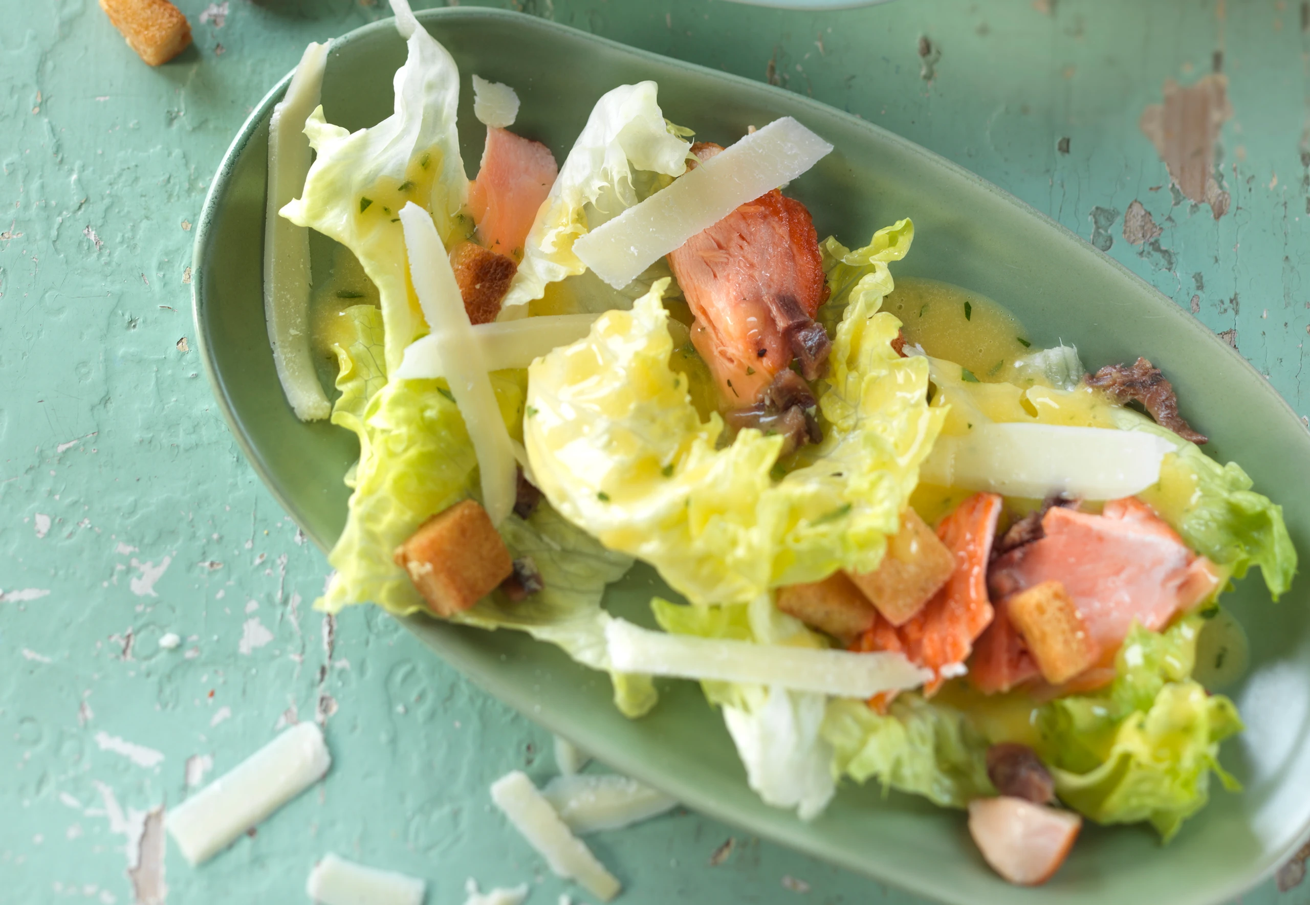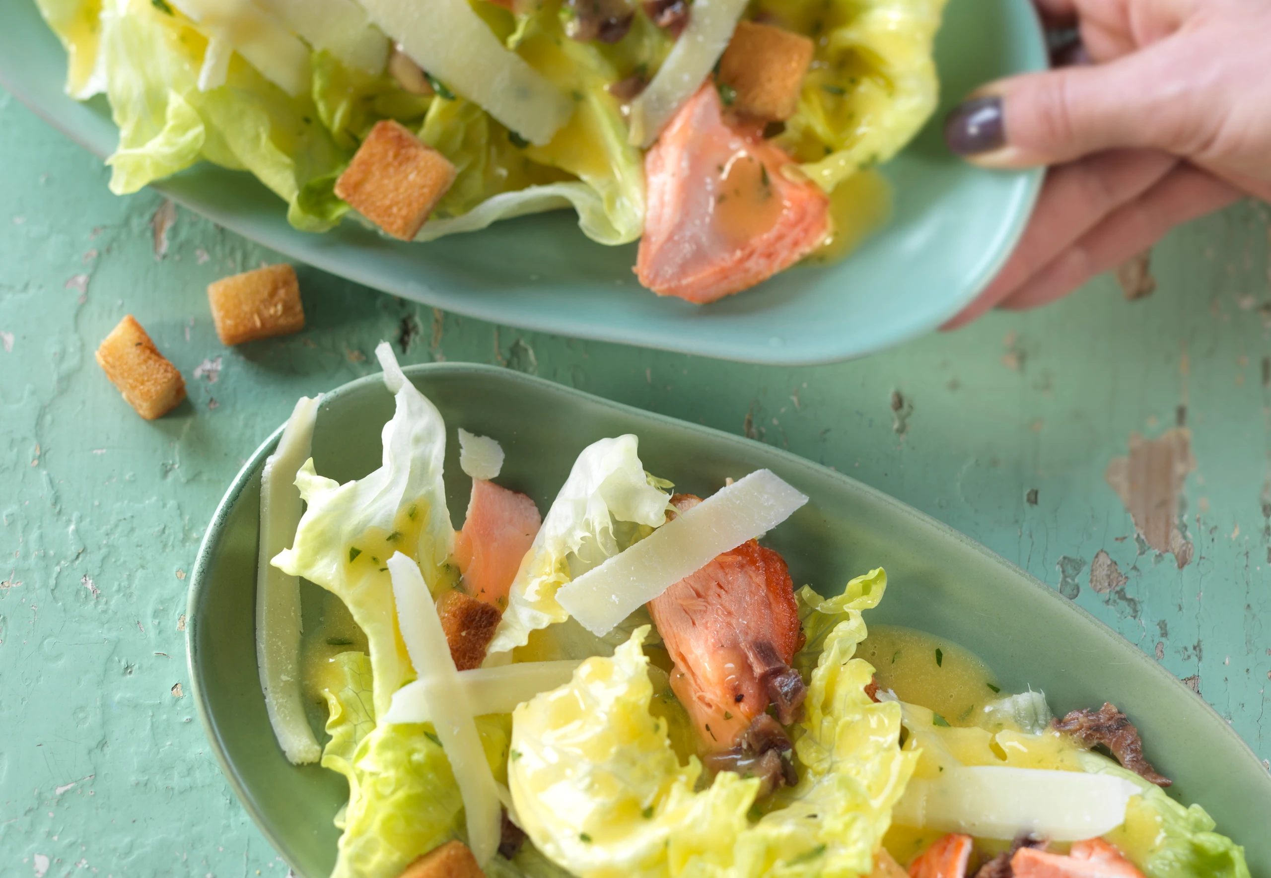 Lachsfilet in kleine Stücke teilen. Salat mit der Marinade vermischen, mit dem Lachs anrichten und mit Brotstücken und Parmesan garniert servieren.
