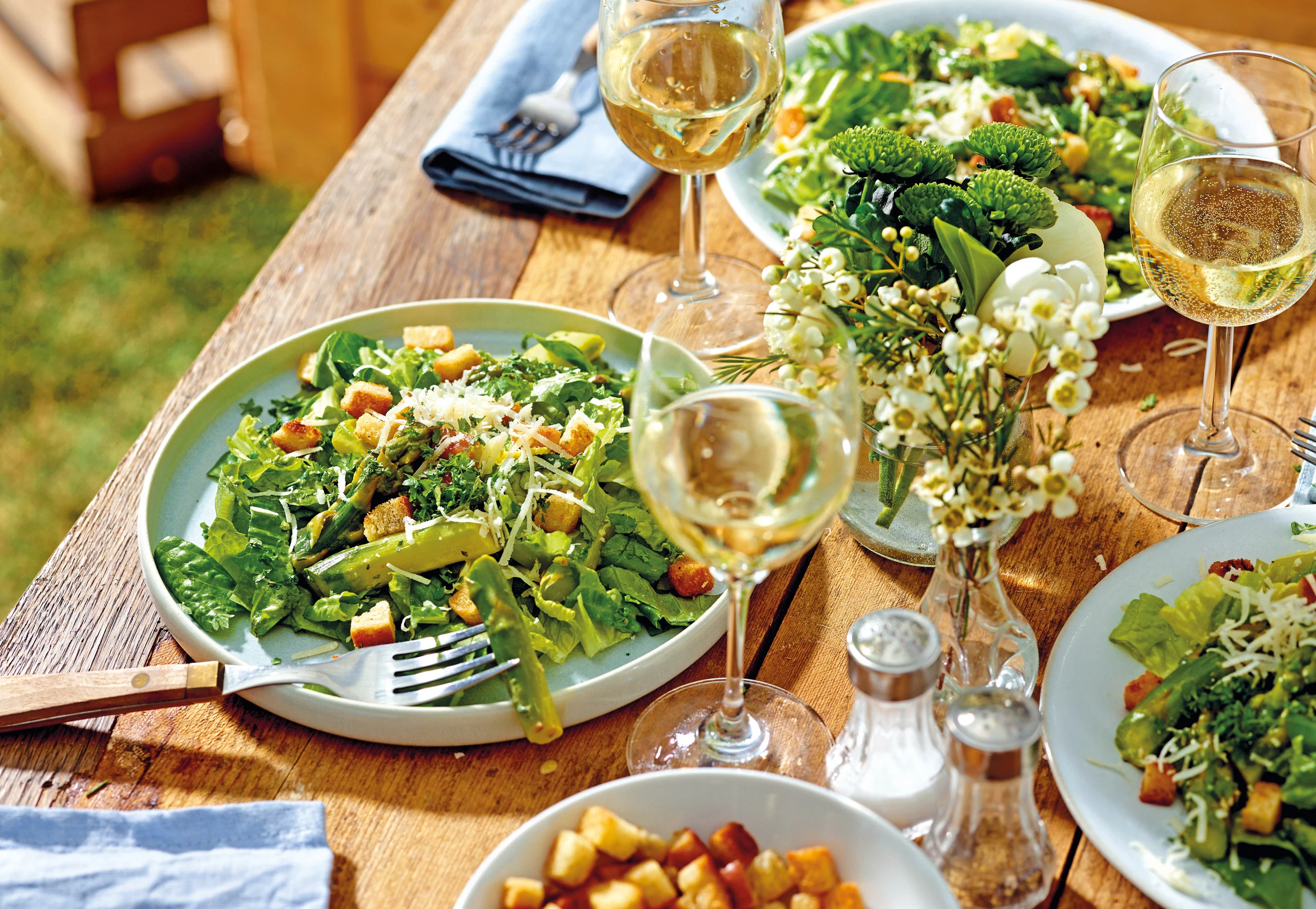 Spargel und Salat mit dem Dressing vermischen, anrichten und mit Brotwürfeln, Petersilie und Parmesan bestreut servieren.