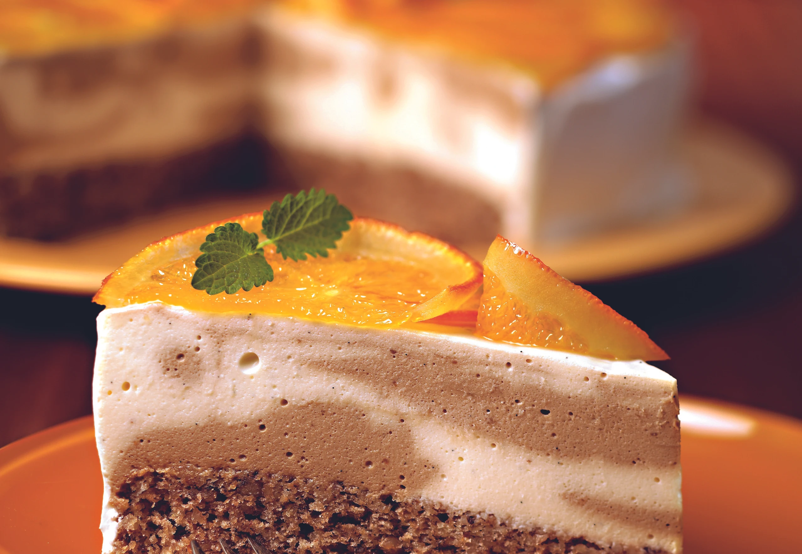 Springform öffnen und den Ring abheben. Obers schlagen und die Torte damit rundum dünn einstreichen. Orangenscheiben abtropfen lassen, die Torte damit belegen. Mit Minze garnieren.
