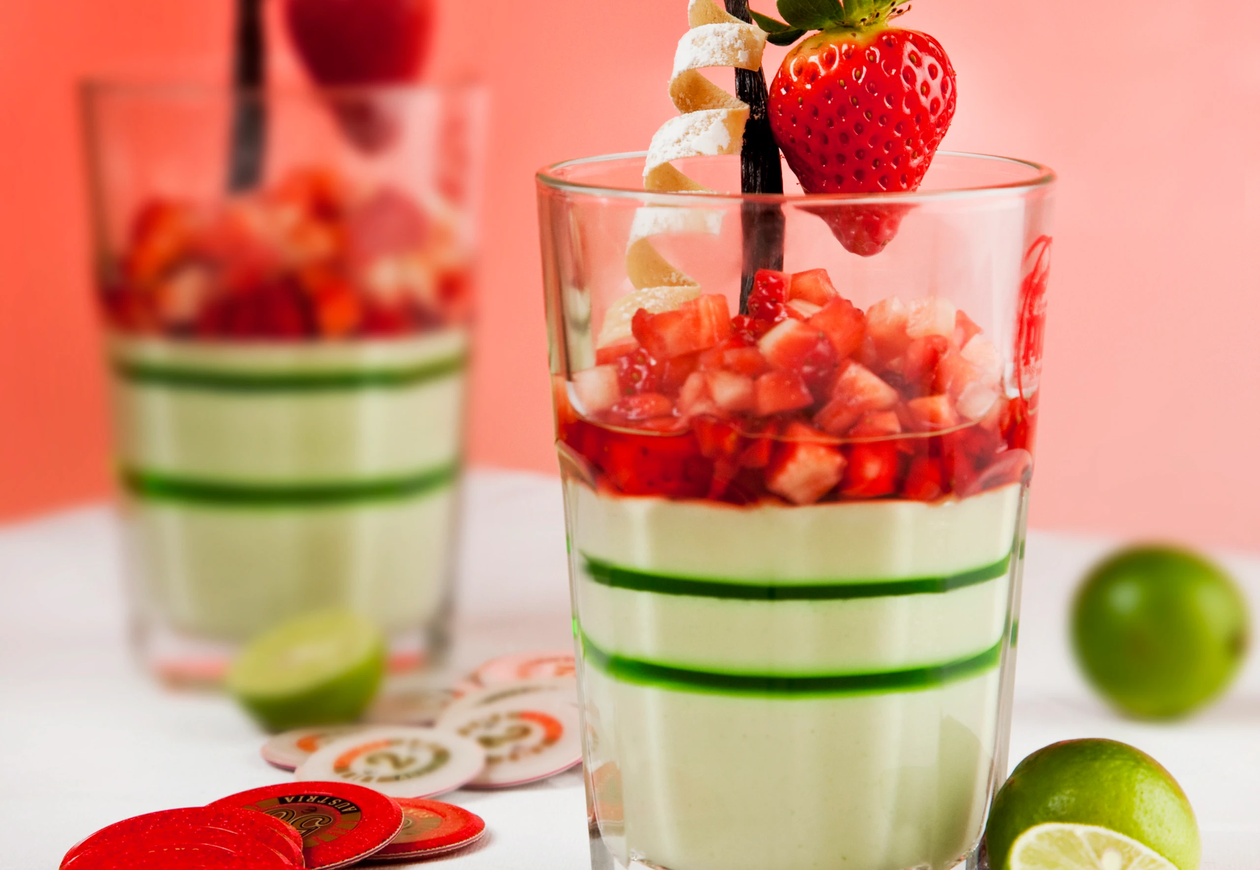 Für die Mousse Gläser (Inhalt 250 ml) vorbereiten. Obers schlagen und kühl stellen. Ei, Dotter, Zucker, Limettensaft und -schale über Dampf dickcremig aufschlagen (dabei muss die Masse an Volumen zunehmen). Masse vom Dampf nehmen und weiterrühren, bis sie abgekühlt ist.