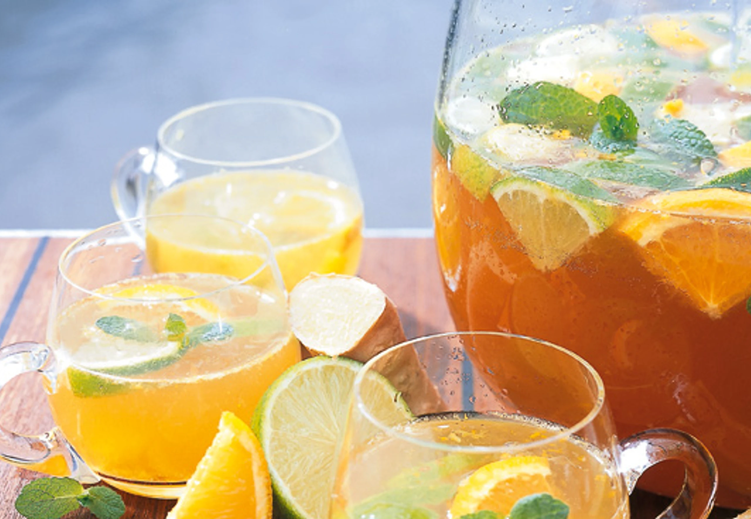 - Für die Eiswürfel abgeriebene Limetten- und Orangenschale mit Limettensaft, Ingwer und 500 ml Mineralwasser verrühren. Mischung in einen Eiswürfelbehälter füllen und für ca. 10 Stunden tiefkühlen.