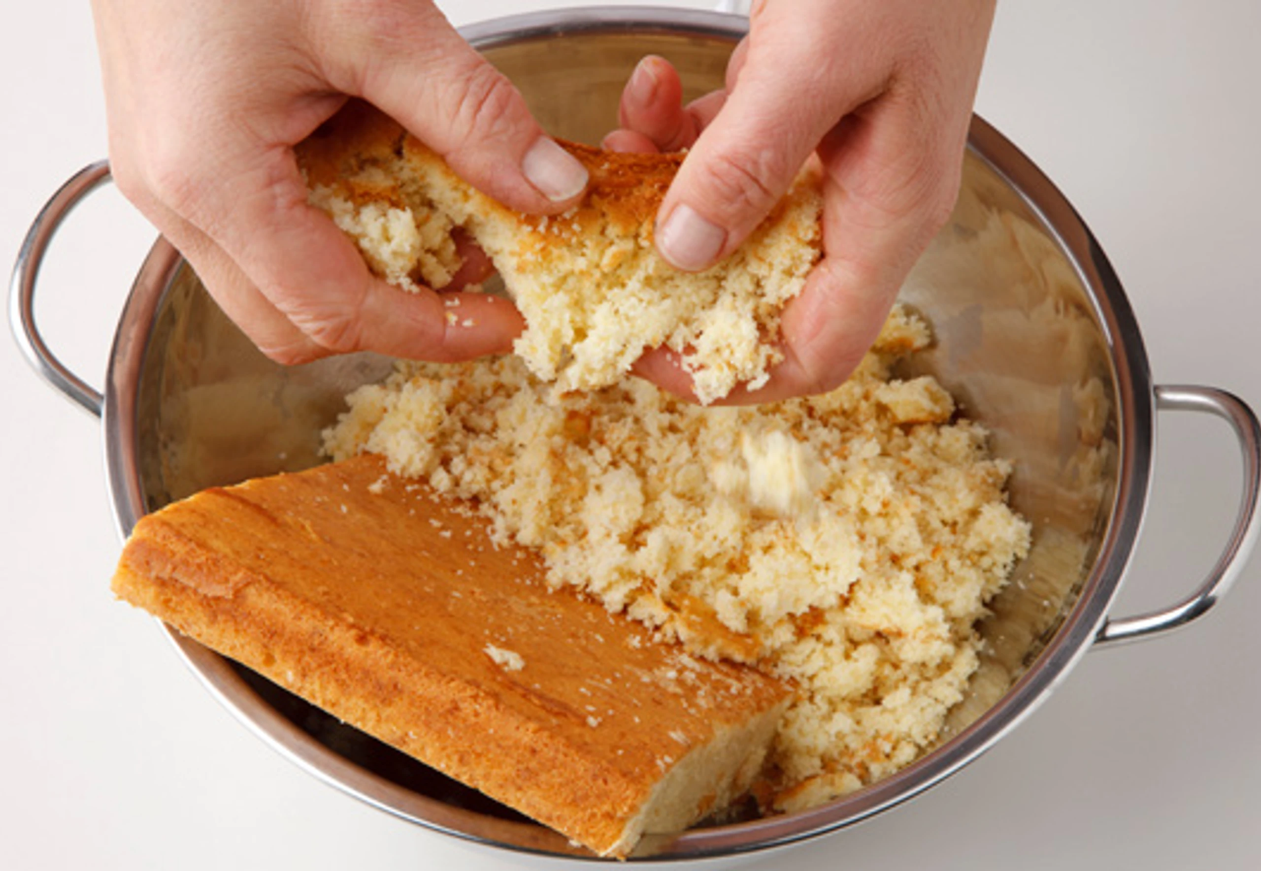 Kuchen mit den Händen fein zerbröseln. Topfen, Rum, Marmelade und Butter mit den Kuchenbröseln glatt vermischen. Masse zu einer Rolle formen, zudecken und ca. 1 Stunde rasten lassen.