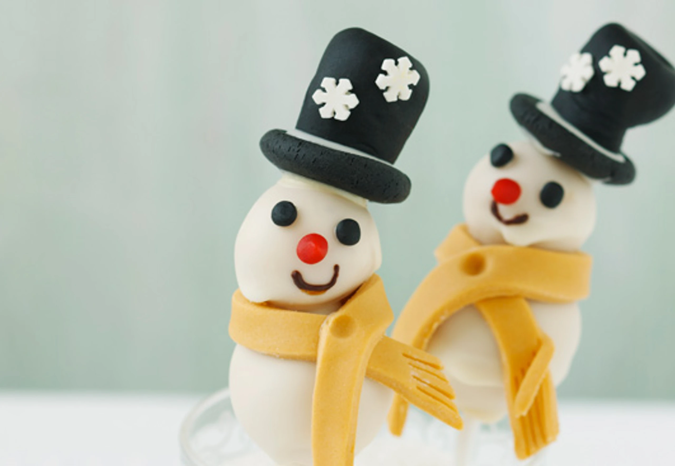 - Aus schwarzem Fondant Zylinder und Augen, aus dem roten Nasen formen. Zylinder mit Zuckerblumen garnieren, Blumen mit Glasur fixieren. Für den Schal hellbraunen Fondant ausrollen (20 x 13 cm), in 10 Längsstreifen schneiden und an den Enden eindrücken. Cake Pops mit Zylinder und Schals garnieren, mit Glasur festkleben.