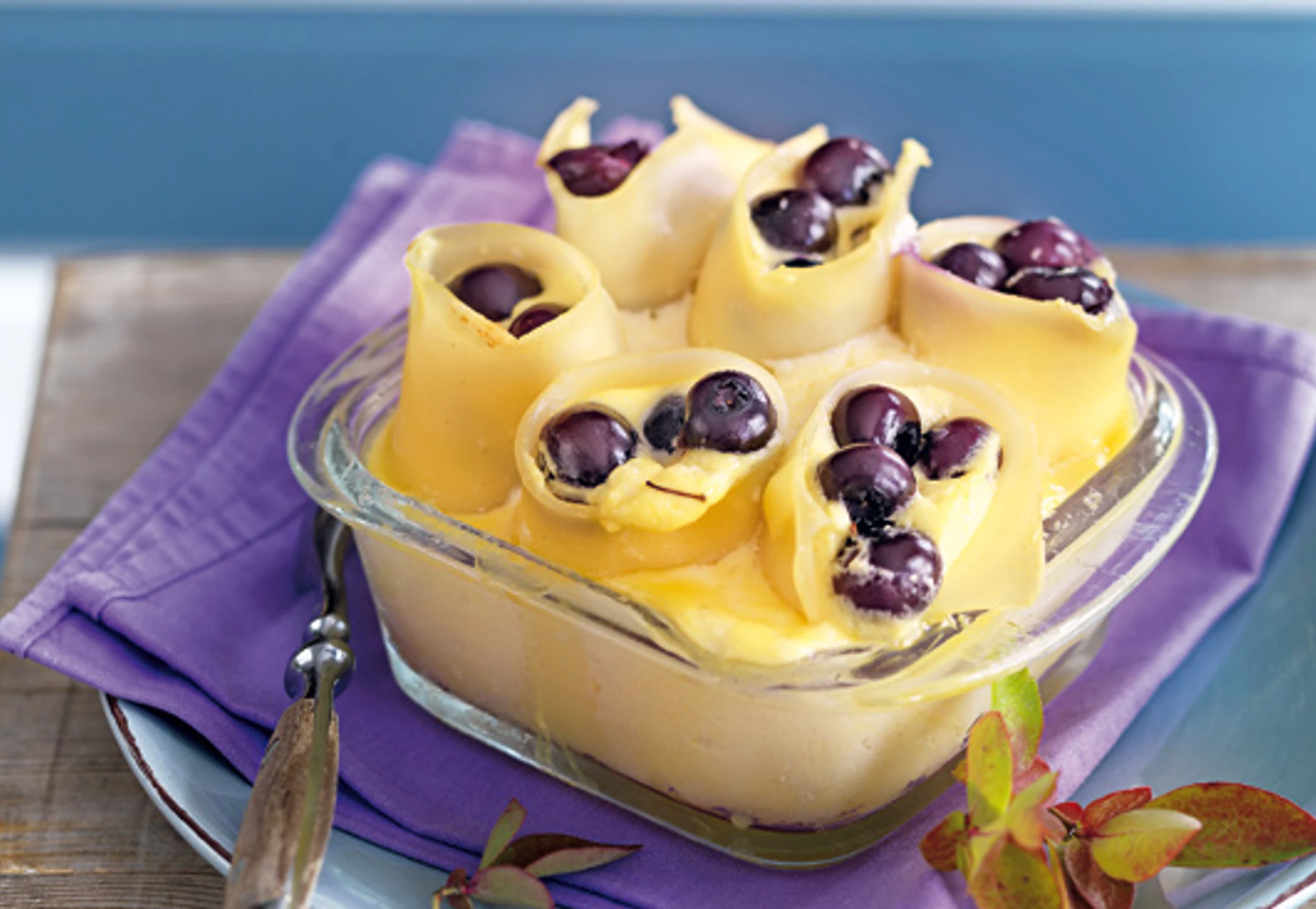 - Für die Fülle Heidelbeeren verlesen. 6 Eier in Dotter und Klar trennen. Topfen, Dotter, 1 Pkg. Vanillezucker, Zitronenschale und 1 Prise Salz verrühren. Eiklar mit Kristallzucker und Stärke zu cremigem Schnee schlagen und unter die Topfenmasse heben. Fülle mit einem Dressiersack in die Cannelloni füllen. Je 6 Cannelloni in eine Form stellen und mit Heidelbeeren belegen.