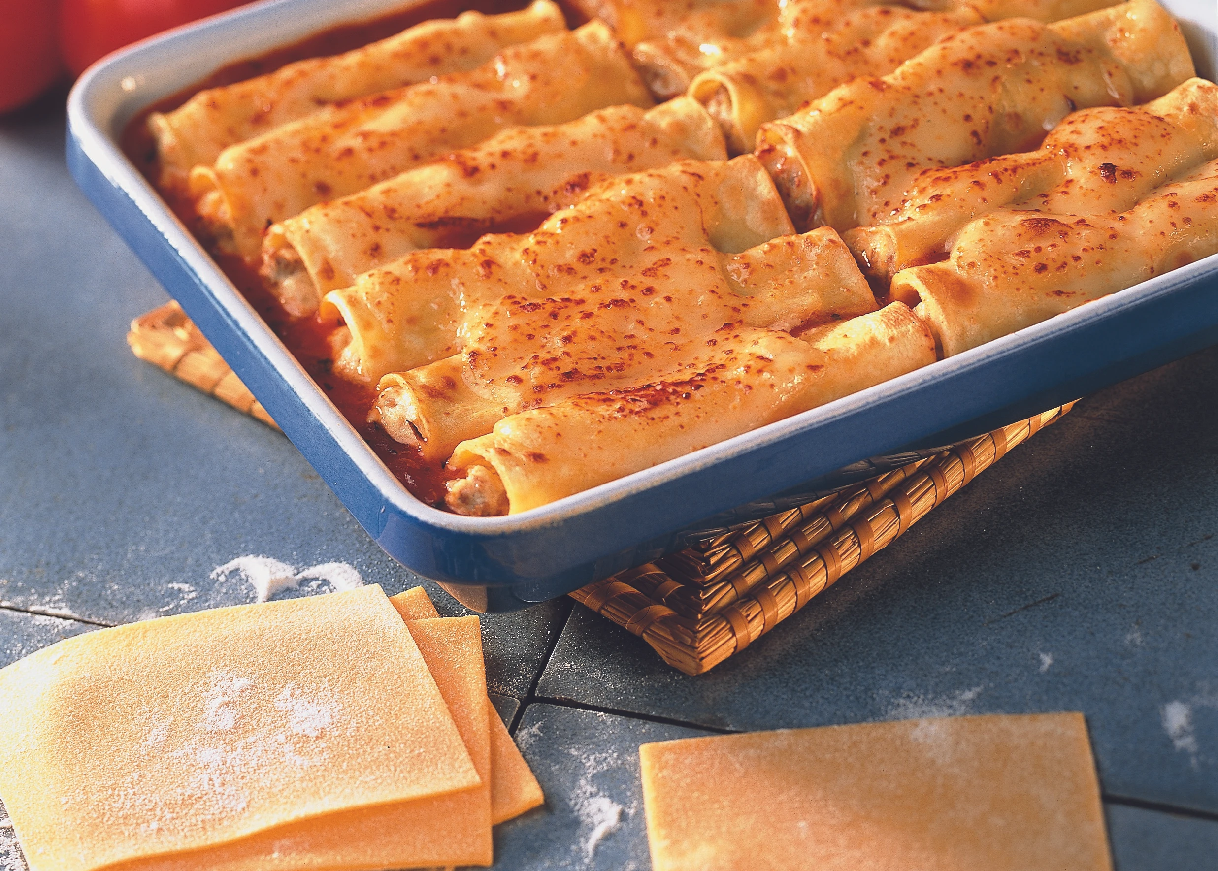 Backrohr auf 200 °C vorheizen. Teig auf einer bemehlten Arbeitsfläche dünn ausrollen (ca. 43 x 27 cm). Teig auf die Größe von 40 x 24 cm zuschneiden, daraus 12 Rechtecke (8 x 10 cm schneiden. Teigblätter ca. 2 Minuten in Salzwasser kochen, herausheben, kalt abschrecken und auf einem Küchentuch trocken tupfen.