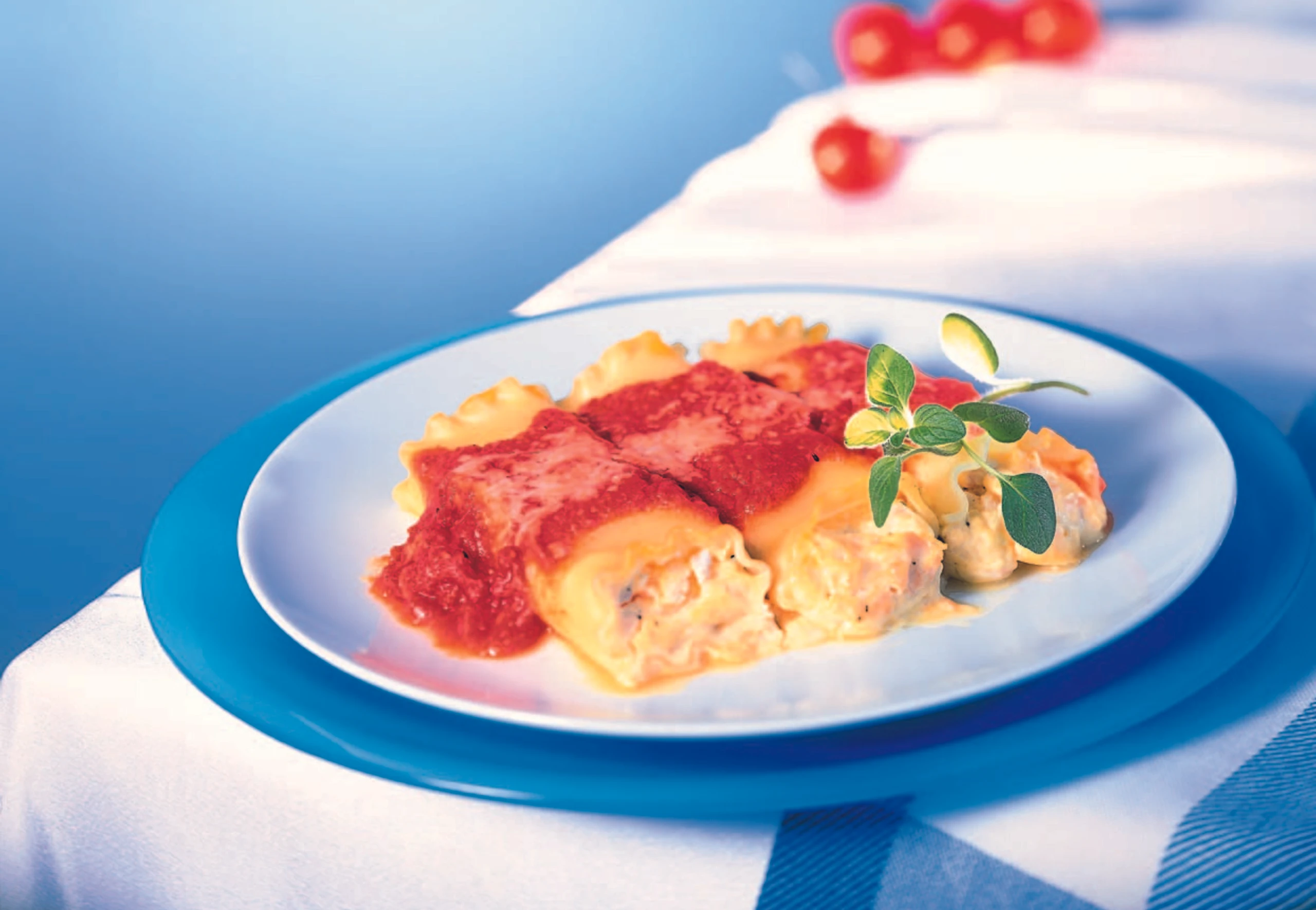 Die Fülle den Längsseiten entlang auf den Teigblättern auftragen. Teig über die Fülle einrollen und mit der Naht nach unten in die Form schichten. Cannelloni mit der Paradeissauce übergießen, mit dem übrigen Käse bestreuen und im vorgeheizten Rohr (mittlere Schiene / Gitterrost) ca. 20 Minuten backen.
