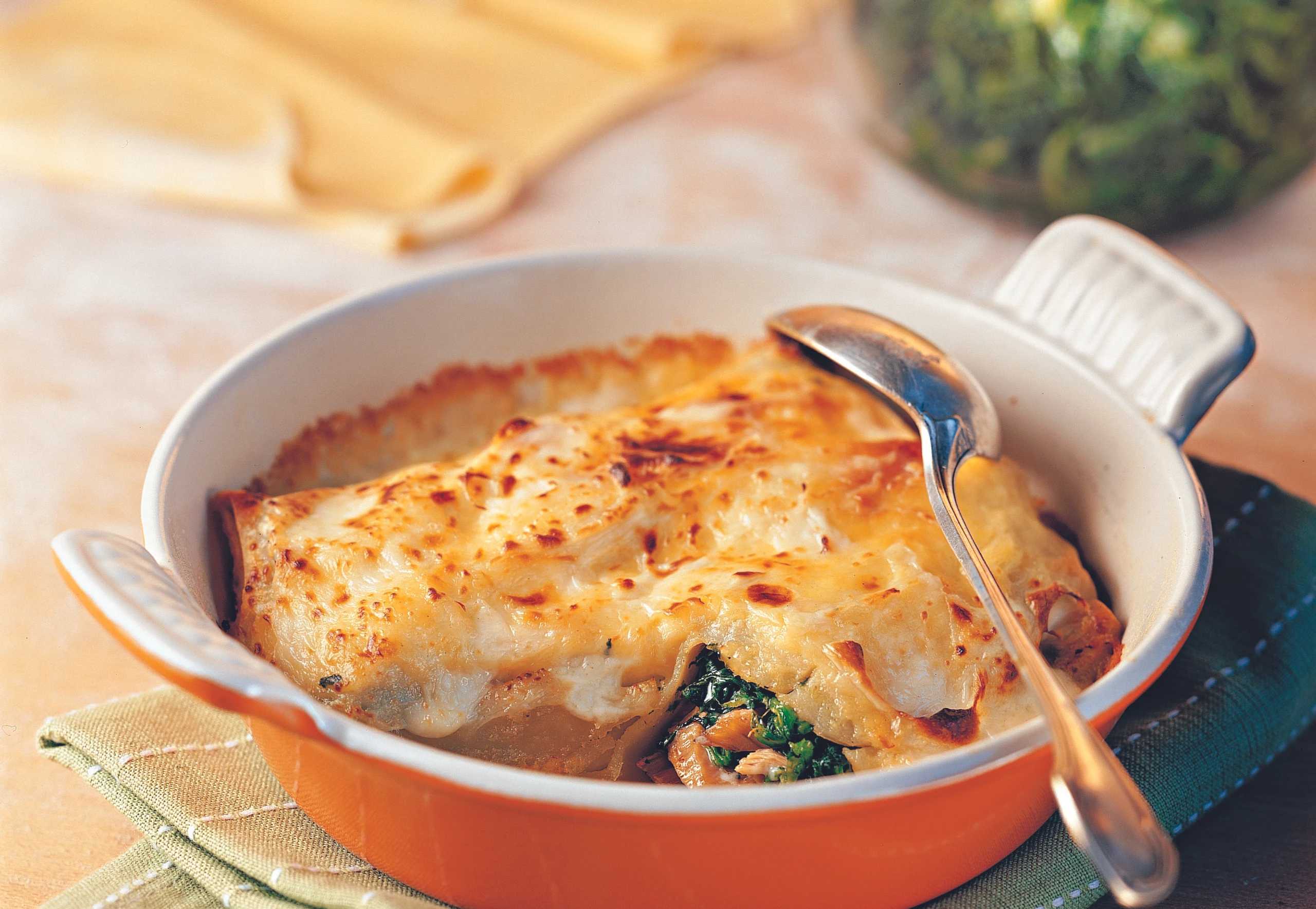 Fülle in einen Dressiersack geben und in die Teigröllchen drücken. Cannelloni in die Form legen, mit der Bechamelsauce überziehen und im Rohr ca. 35 Minuten backen.