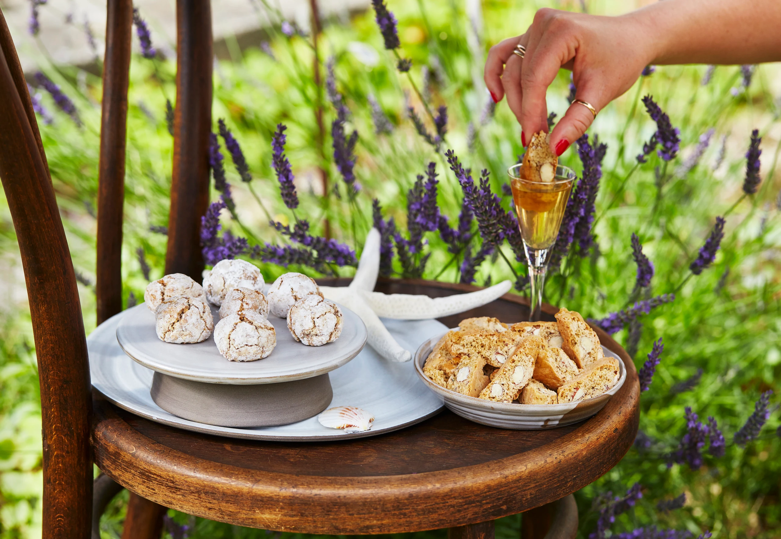 Scheiben auf dem Backpapier verteilen, ca. 5 Minuten backen, herausnehmen und auskühlen lassen. In Italien tunkt man Cantuccini in ein gutes Glas Vin Santo.