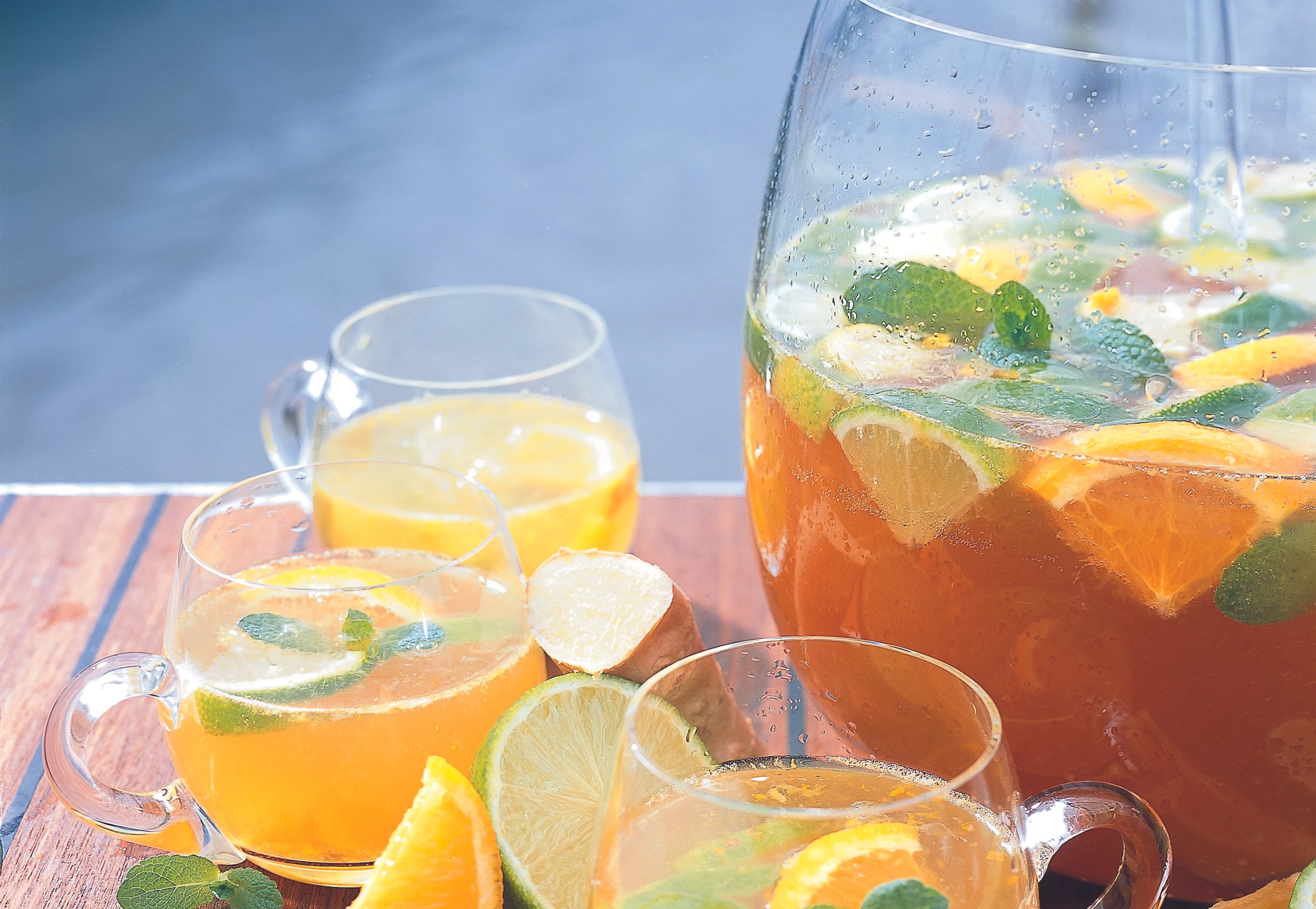 Vor dem Servieren Eiswürfel in die Bowle geben und mit Mineralwasser und Sekt aufgießen.