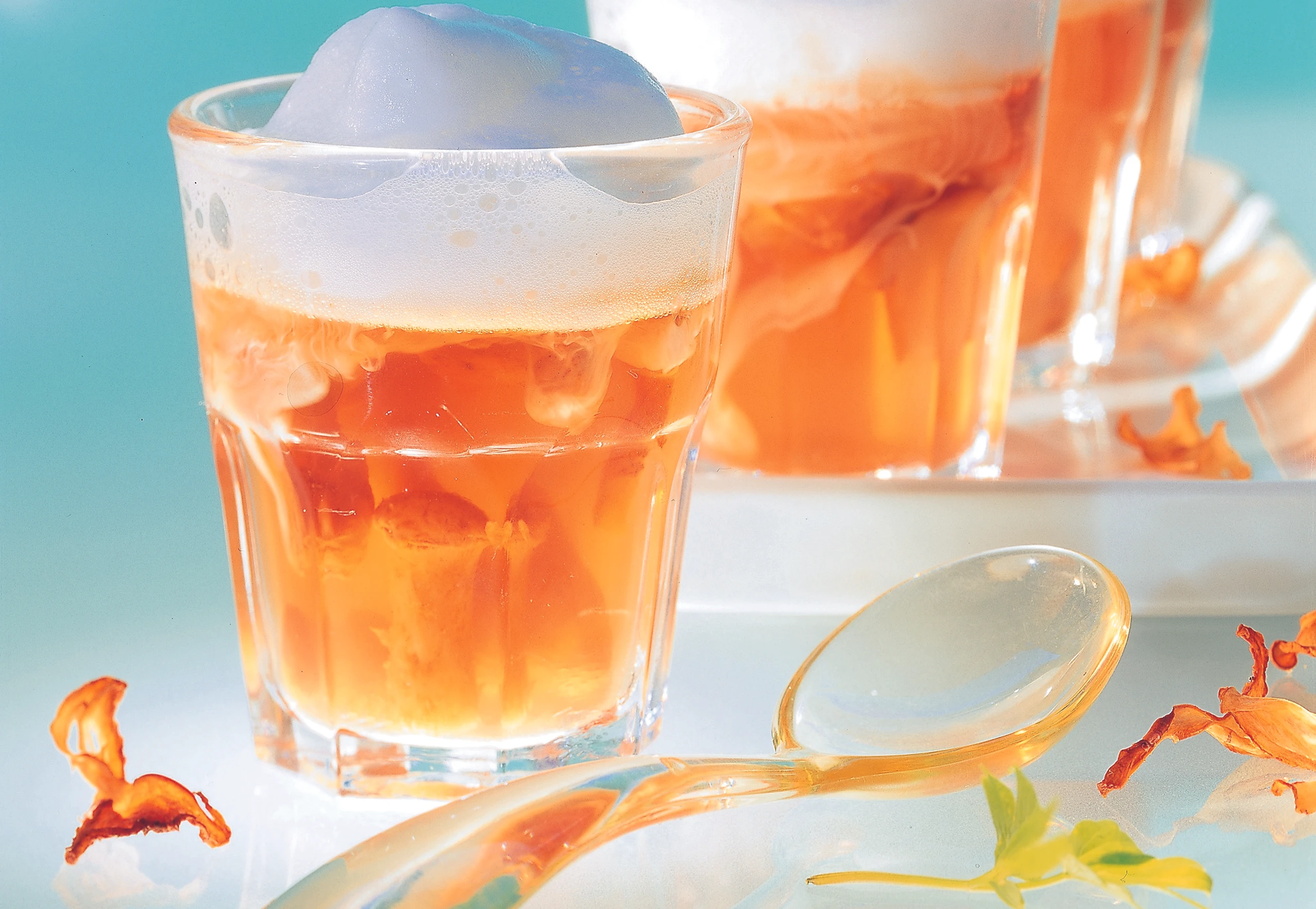 - Milch mit den reservierten 2 EL Suppe mischen, mit Salz und Pfeffer abschmecken, leicht erwärmen und aufschäumen. Als kleines Häubchen auf die Eierschwammerl-Suppe setzen.